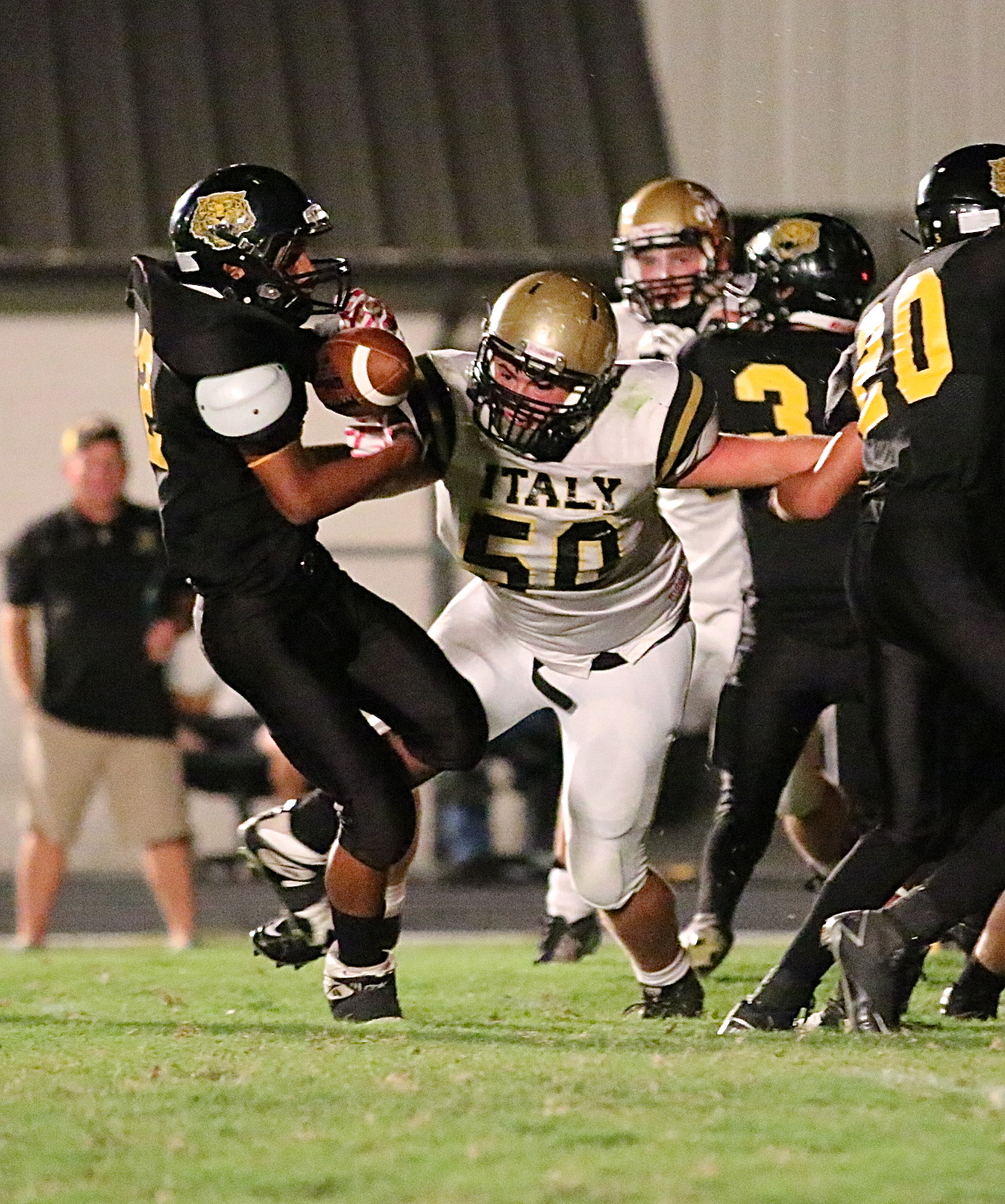 Itasca’s mascot is a mythical cat but Italy’s 46-6 win was no illusion « previous story album next » Hello! Zain Byers(50) greets a Cat runner for a loss in the backfield near Italy’s goal line. (Barry Byers) Download original photo