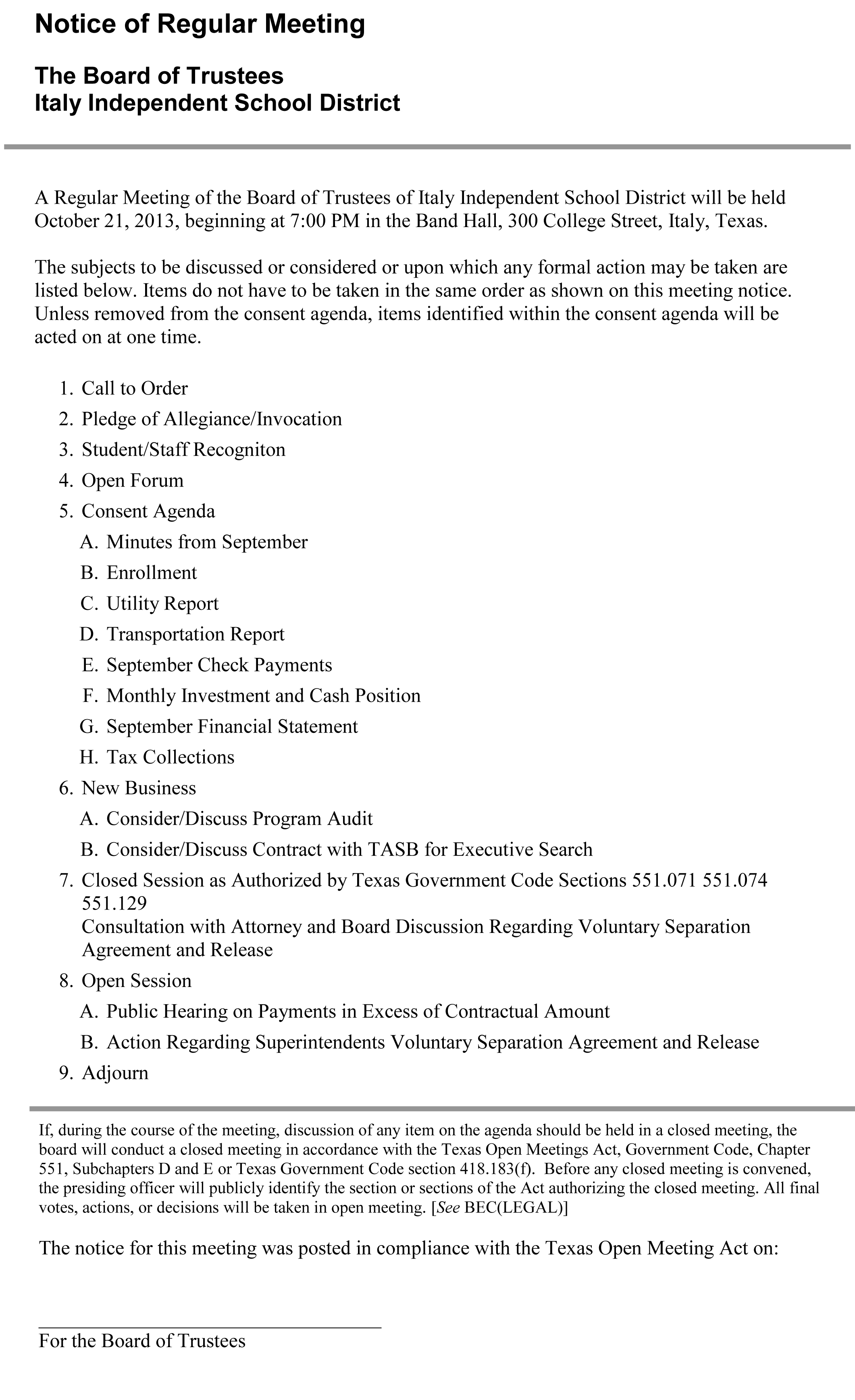 Agenda: Italy ISD School Board Meeting – October 21, 2013 « previous story album next » Download original photo