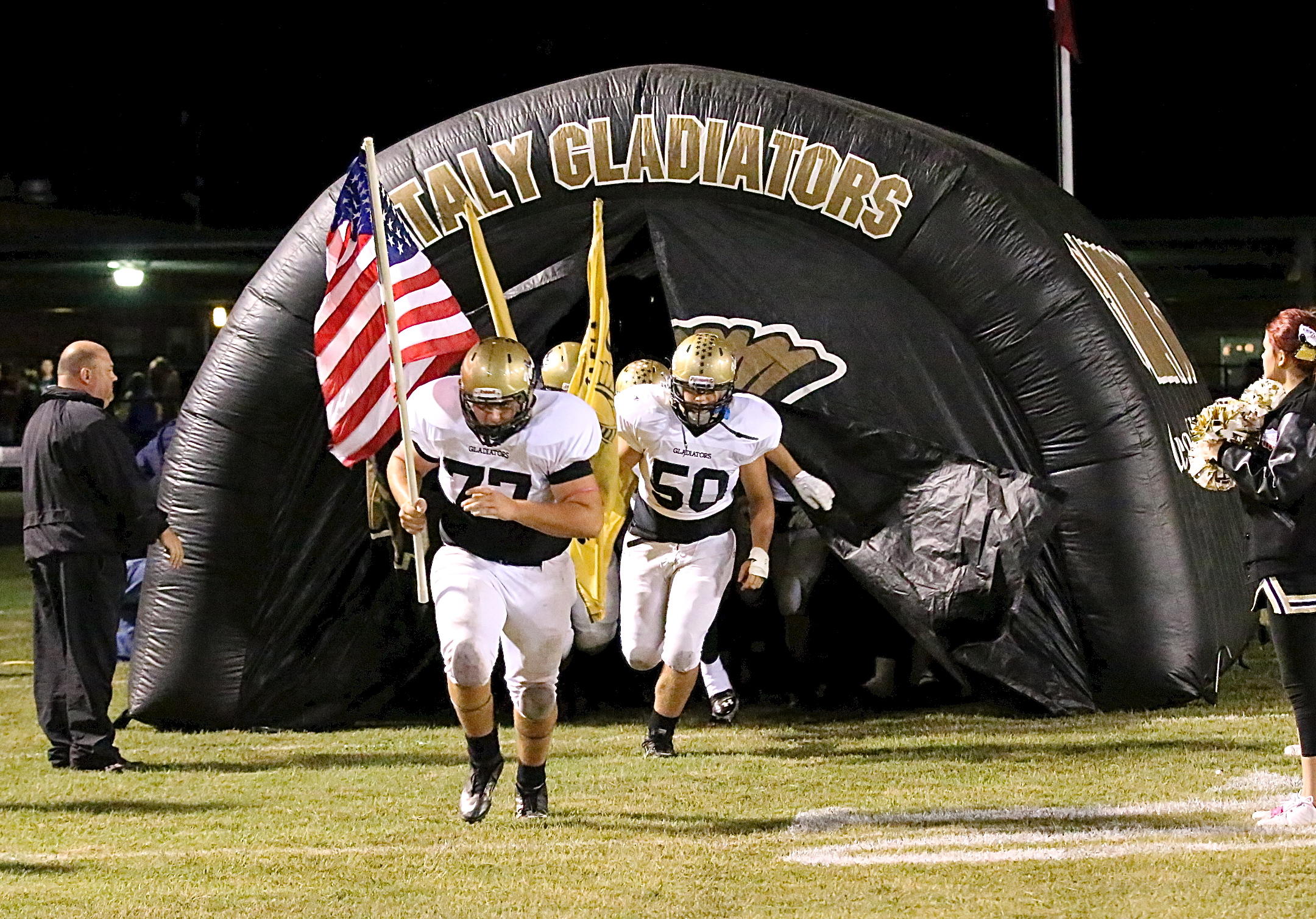 Italy comes to a Crossroads but drives straight ahead for the district win « previous story album next » Two of Italy’s 12 seniors in Kevin Roldan(77) and Zain Byers(50) lead the Gladiators onto the field and into a district battle with Crossroads. (Barry Byers) Download original photo