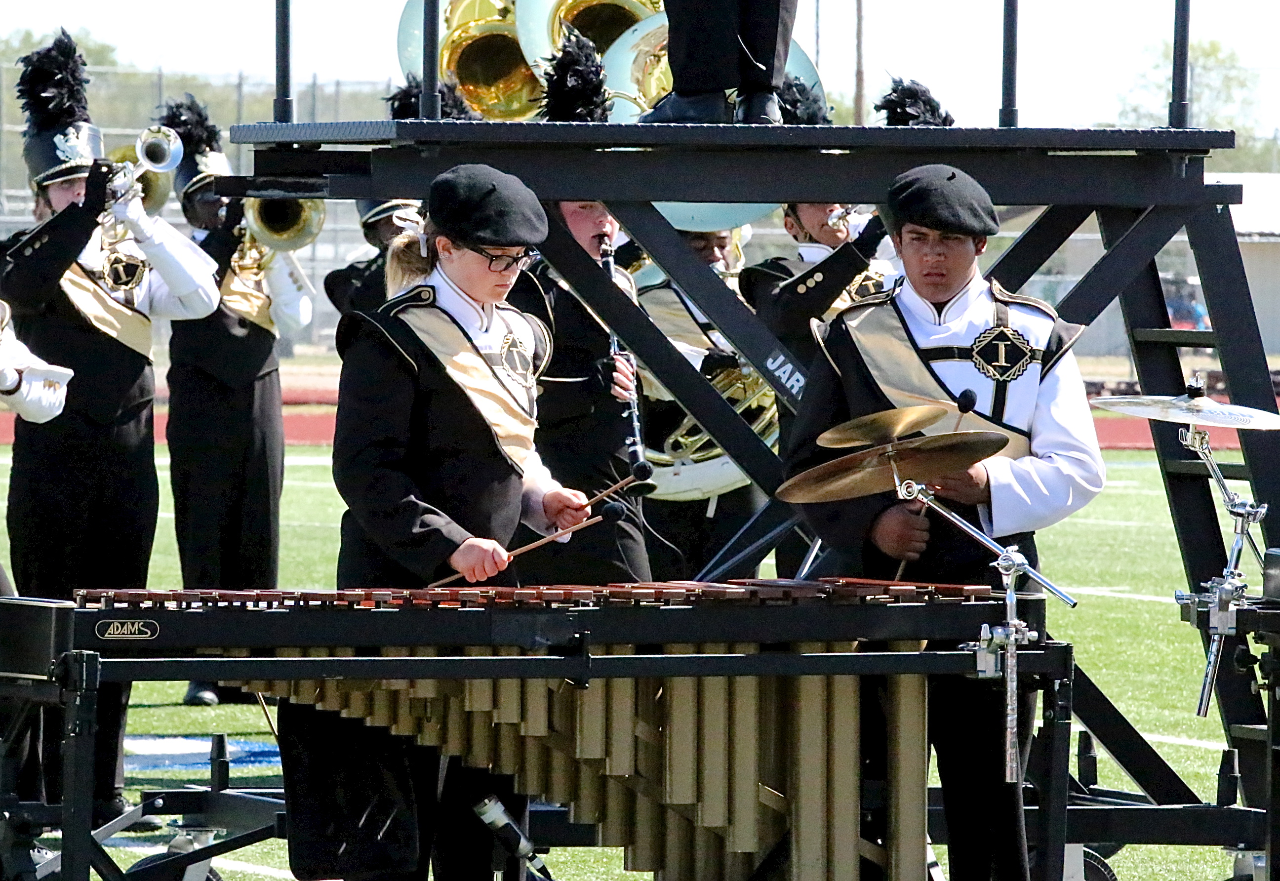 Gladiator Regiment Band and Color Guard advances to Area « previous story album next » Reagan Adams plays the marimba with assistance from band mate Chris Davila. (Barry Byers) Download original photo