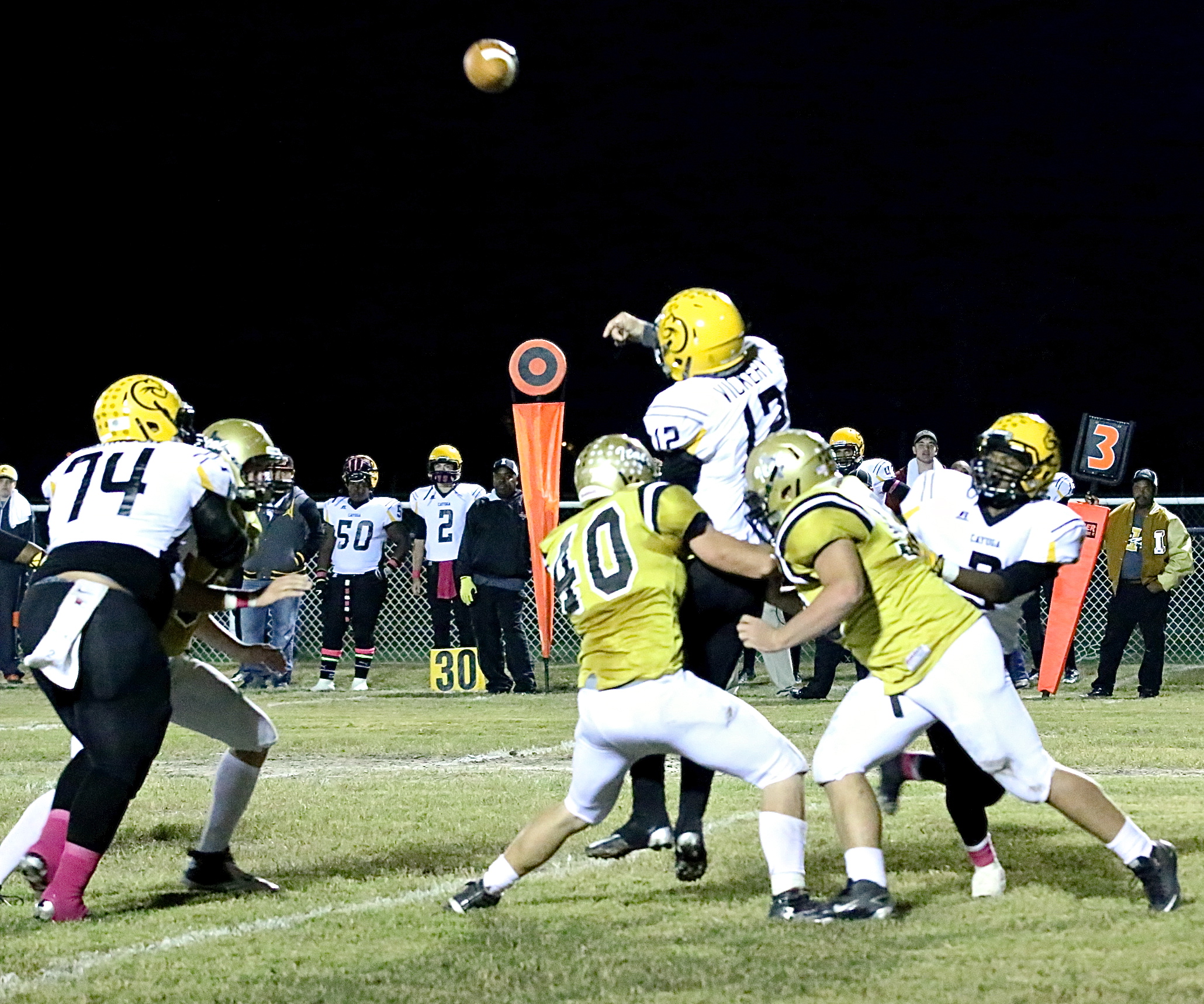 Enjoy more thrilling homecoming moments from Italy’s 42-14 win over Cayuga « previous story album next » Coby Bland(40) and Zain Byers(50) close in on Cayuga’s quarterback to force an incomplete pass. (Barry Byers) Download original photo