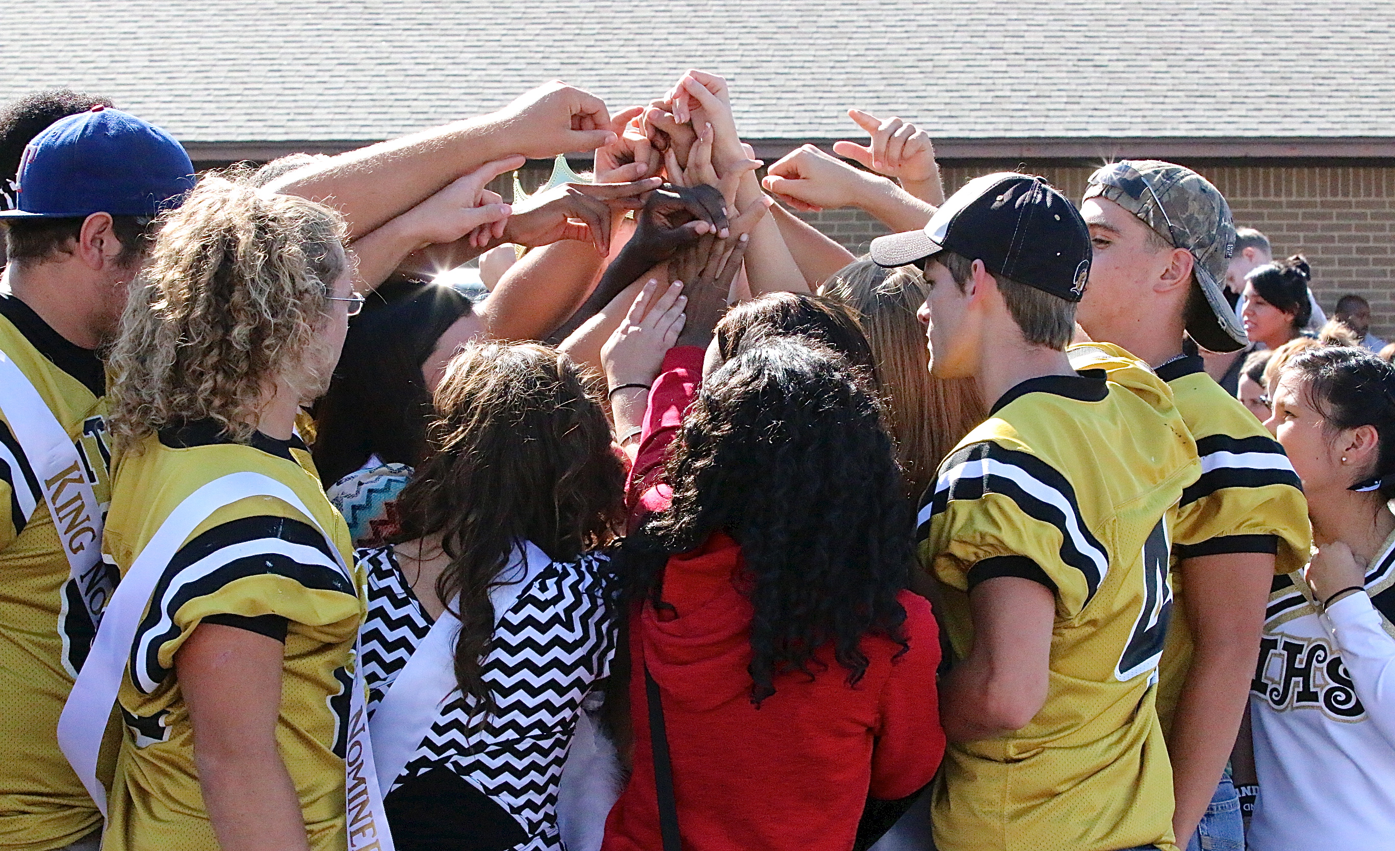 Senior Gladiators Kevin Roldan, Shad Newman, Justin Wood and Cody Medrano join their classmates in the senior circle following the downtown homecoming pep rally. (Barry Byers)