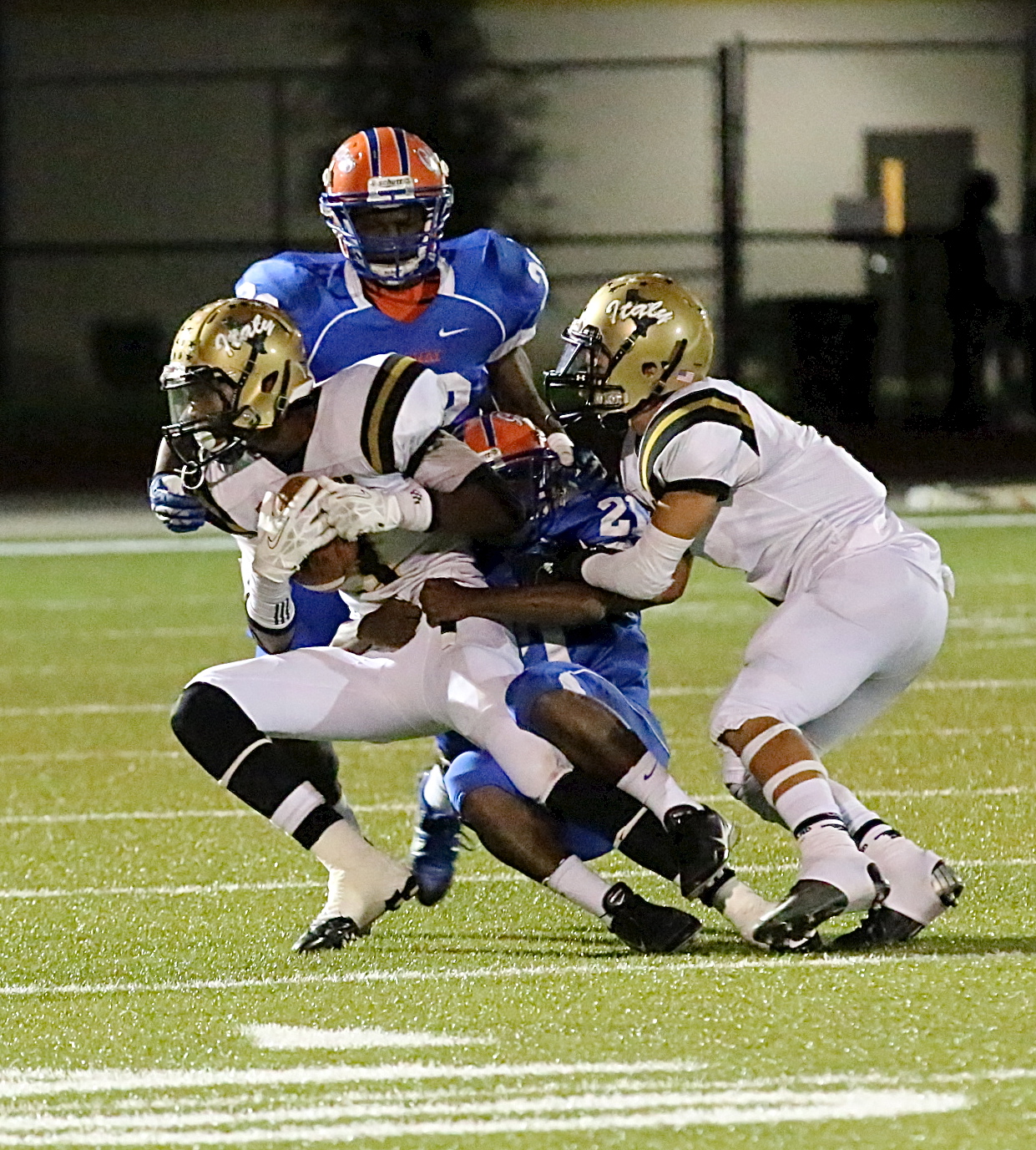 The first half was dominated by Gateway but Italy rallies late for 28-24 win « previous story album next » Making the catch and then fighting for additional yardage is Trevon Robertson(3) with teammate Levi McBride(1) trying to loosen the Gator grip. (Barry Byers) Download original photo
