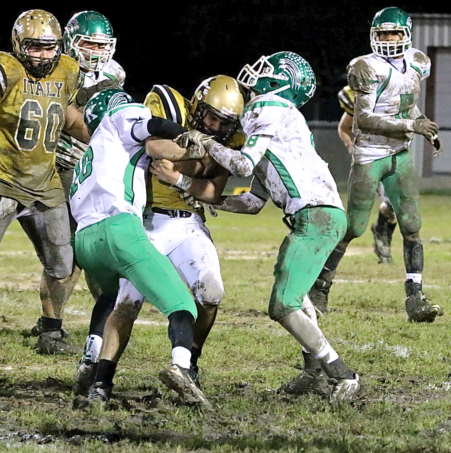 The Italy Gladiators turned muddogs to defeat the Kerens Bobcats for the title « previous story album next » Senior backup quarterback/running back Tyler Anderson(11) tries to fight off a pair of Bobcat tacklers. (Barry Byers) Download original photo