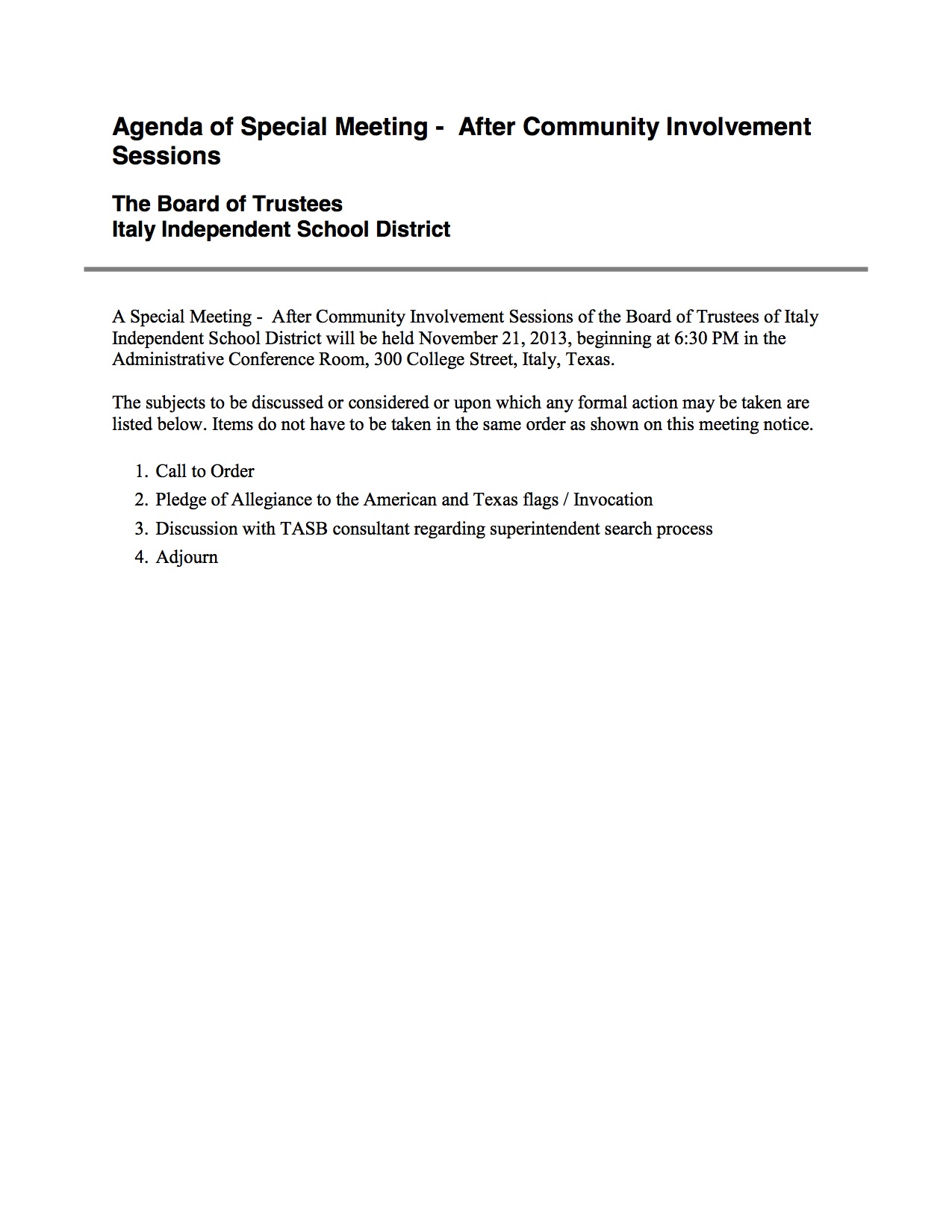 Agenda: Italy ISD School Board Special Meeting – Thursday, November 21, 2013 « previous story album next » Download original photo