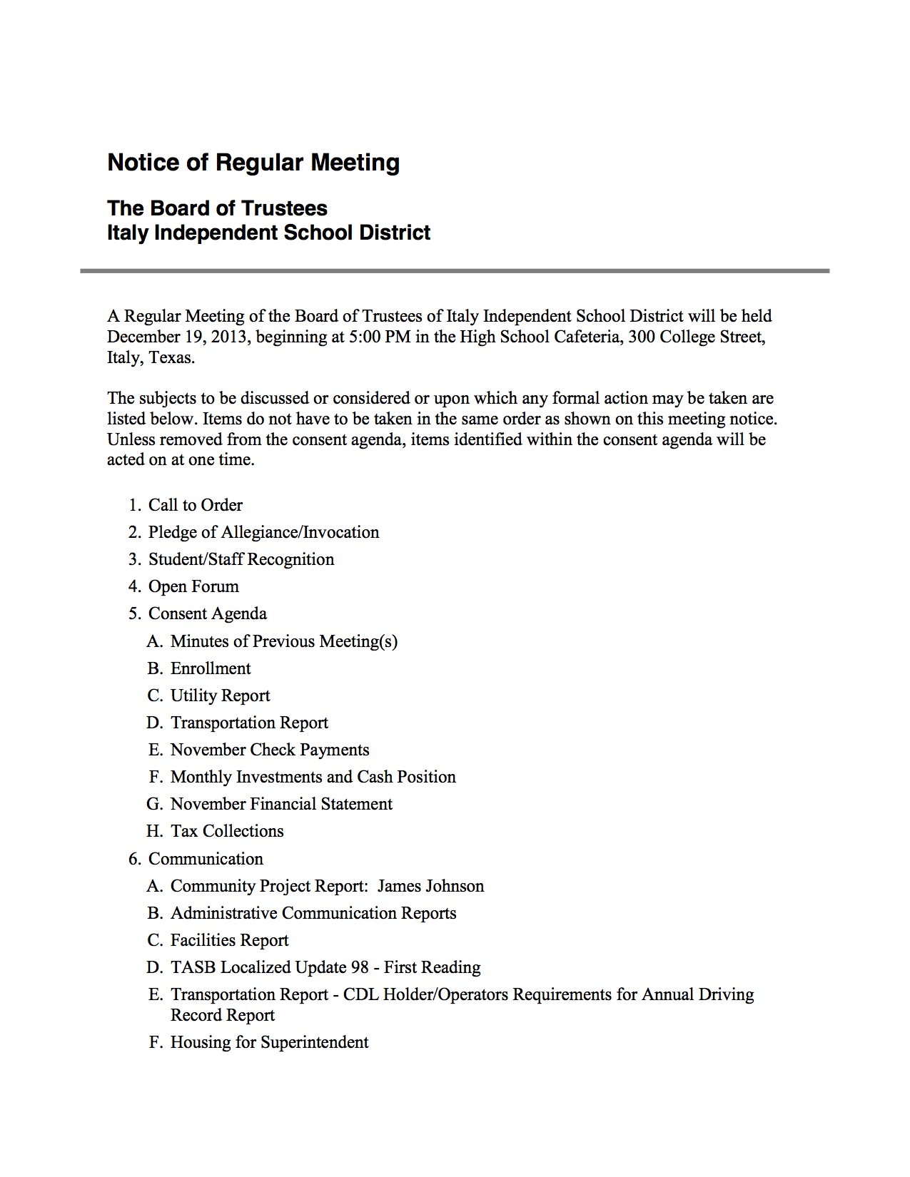Agenda: Italy ISD School Board Meeting – Thursday, December 19, 2013