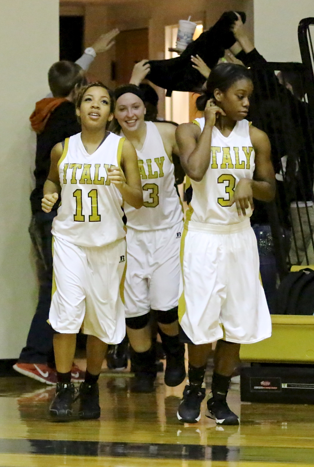 Ryisha Copeland(11), Jaclynn Lewis(13), Kortnei Johnson(3) and their teammates get support from fans Levi McBride, Clayton Miller, Ashlyn Jacinto and Jack Hernandez as they return to the court for the second-half. In that moment, 4 fans equalled 4,000! (Barry Byers)