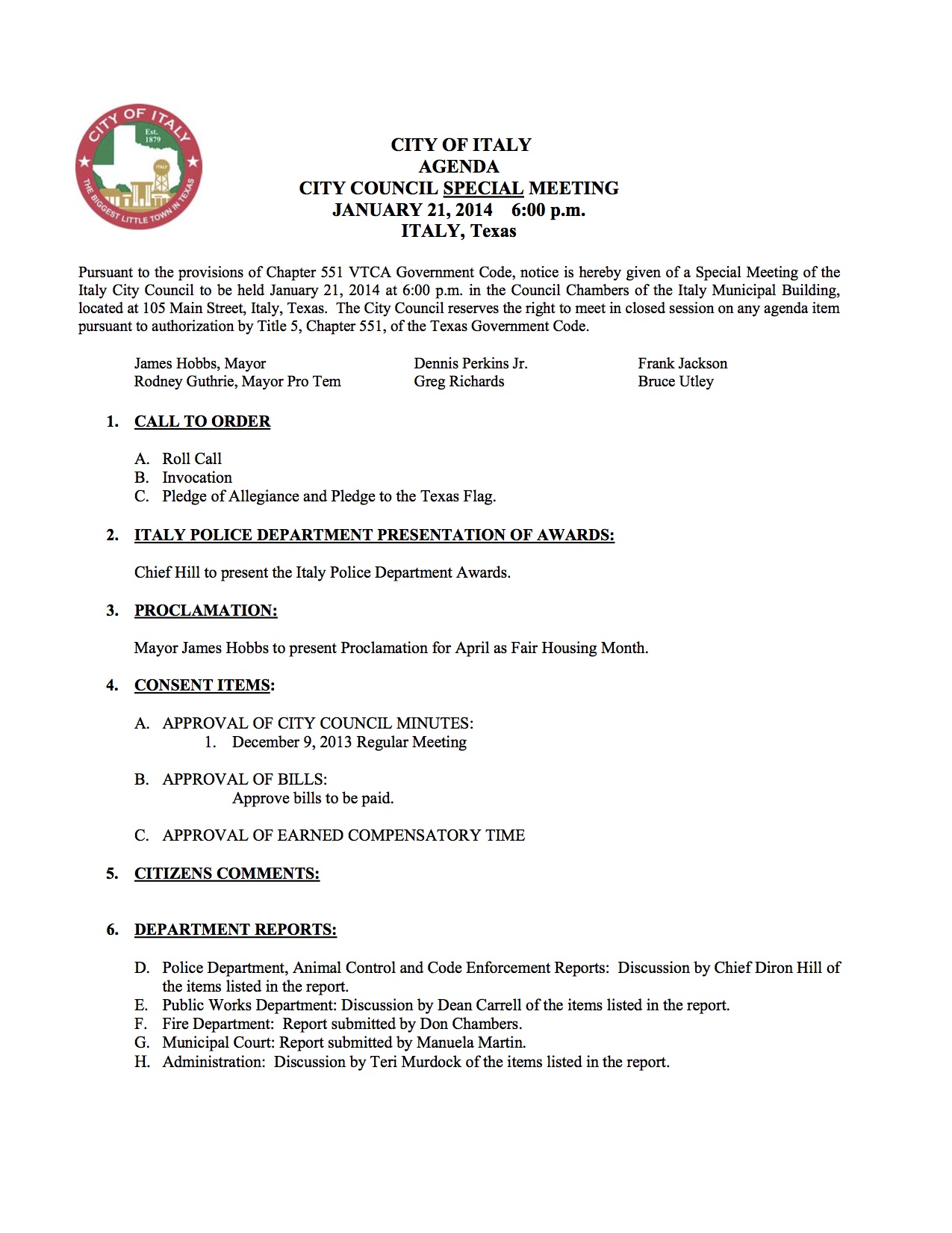 Agenda: Italy City Council Special Meeting—Tuesday, January 21, 2014 « previous story album next » Agenda – page 1 (http://www.ci.italy.tx.us) Download original photo