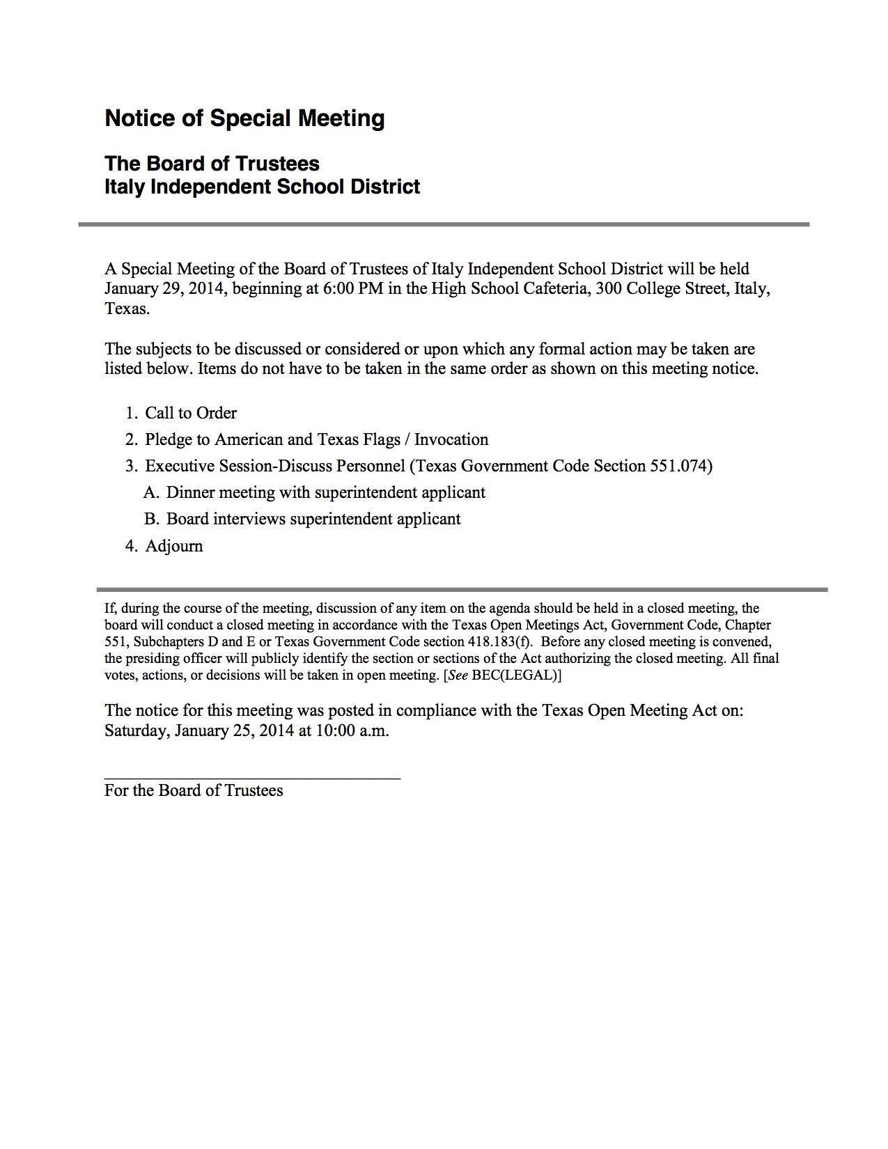 Agendas: Italy ISD School Board Meetings-January 27, 28, 29 and 30, 2014 « previous story album next » Agenda – Wednesday, January 29, 2014 Download original photo