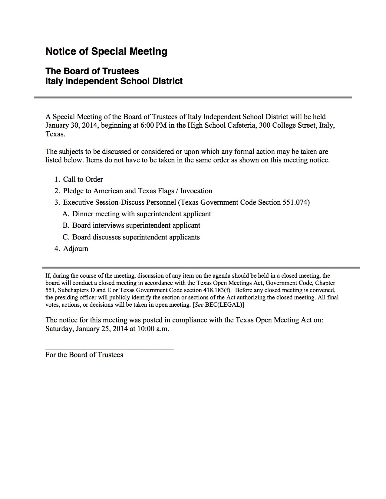 Agendas: Italy ISD School Board Meetings-January 27, 28, 29 and 30, 2014 « previous story album next » Agenda – Thursday, January 30, 2014 Download original photo