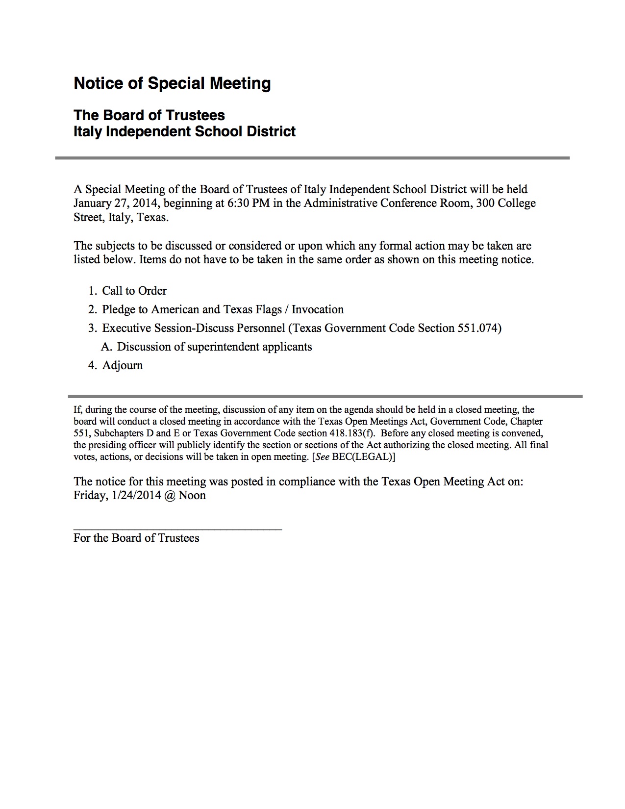 Agendas: Italy ISD School Board Meetings-January 27, 28, 29 and 30, 2014 « previous story album next » Agenda – Monday, January 27, 2014 Download original photo
