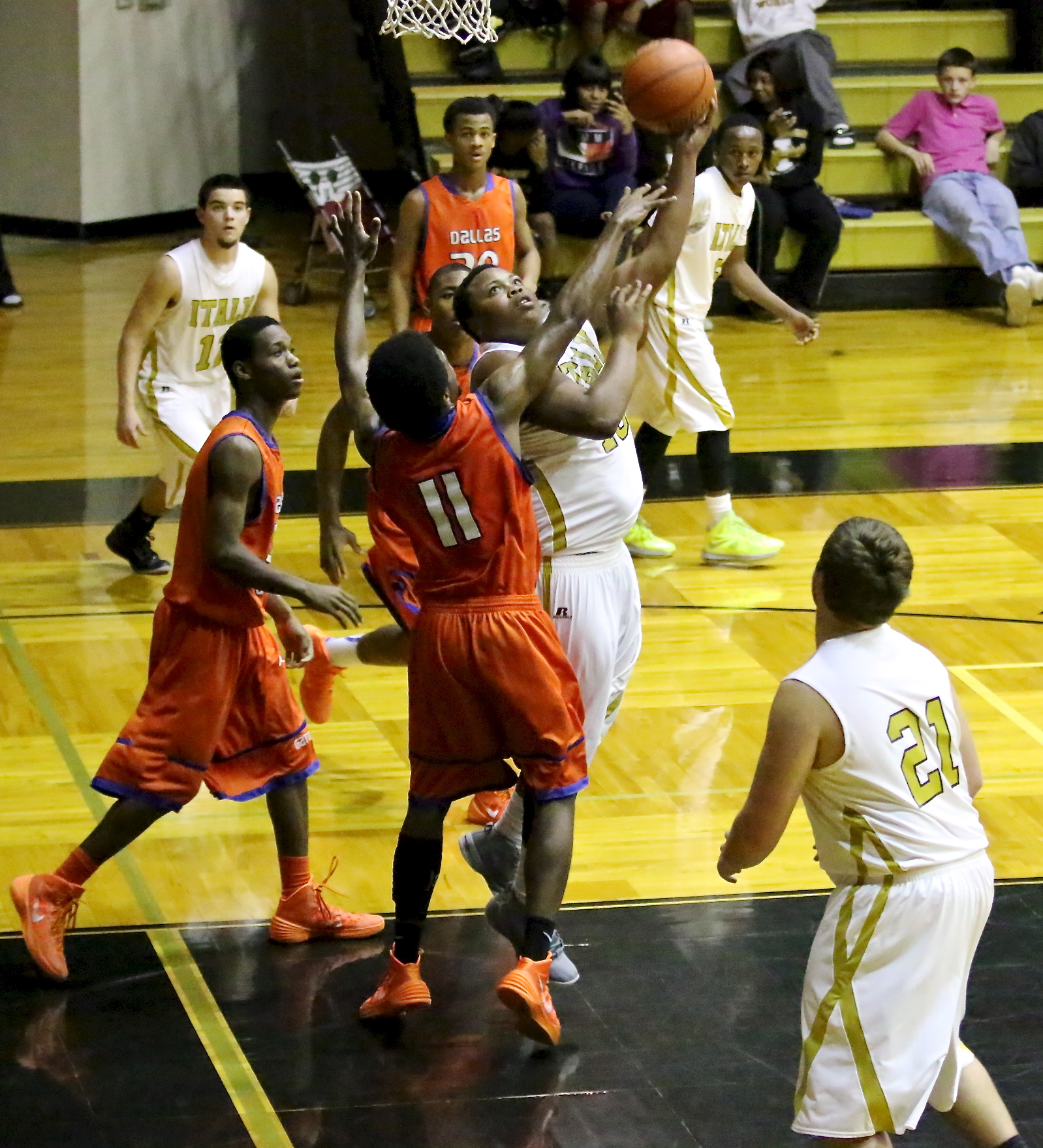 Darol Mayberry(13) maneuvers under the basket to flip up a shot for the Gladiators. Italy was playing an uphill battle against Dallas Gateway who won the matchup, 89-54, to take control of the district’s top spot. (Barry Byers)