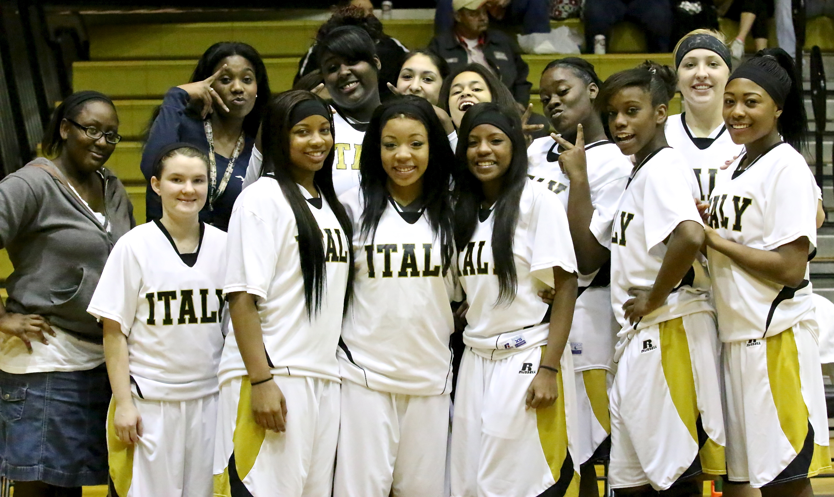 Seniors, Bernice Hailey, Ryisha Copeland and Kendra Copeland are surrounded by love from their teammates before the start of their district game against Grand Prairie Advantage. (Barry Byers)