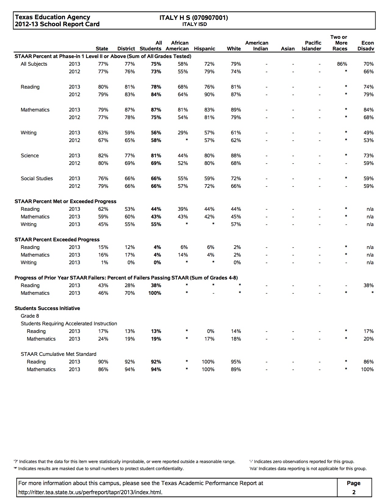 Italy ISD’s TEA 2012-2013 School Report Card « previous story album next » Italy ISD’s TEA 2012-2013 School Report Card – page 2 Download original photo