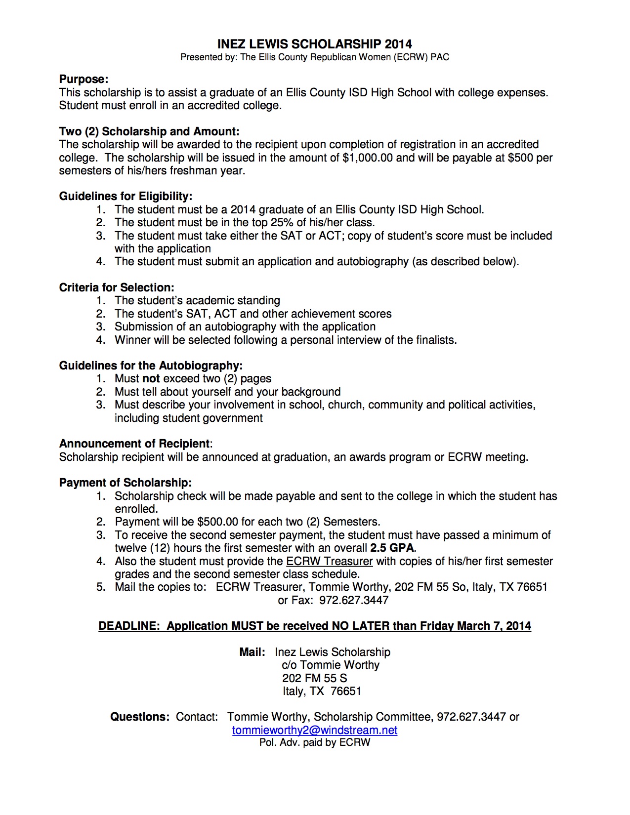 Local Scholarships and Additional Scholarship Opportunities « previous story album next » Inez Lewis Scholarship 2014 – guidelines Download original photo