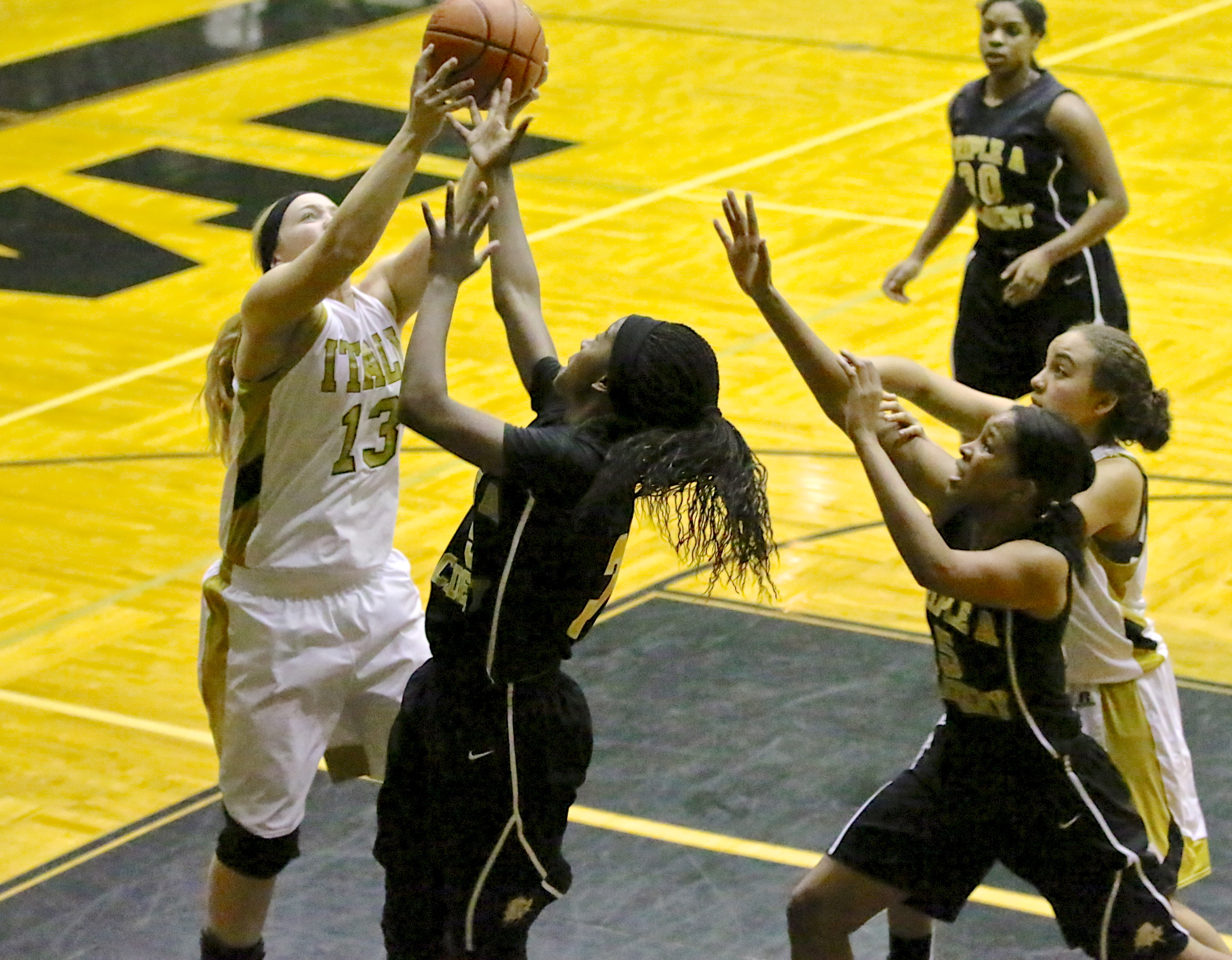 Triple A Academy wins the war but the Lady Gladiators win some personal battles « previous story album next » Jaclynn Lewis grabs an offensive board and then scores the put back for Italy. (Barry Byers) Download original photo
