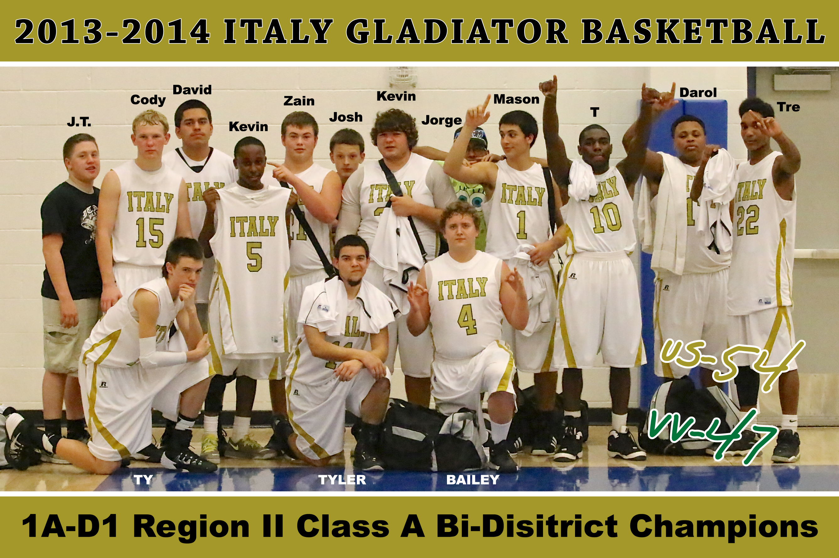 Mission accomplished! The G-Men take care of business against Valley View 54-47 to win the 2014 1A-D1 Region II Class A Bi-District Championship!! Back row (L-R): Manager John Escamilla, Cody Boyd(15), Davis De La Hoya(20), Kevin Johnson(5), Zain Byers(21), Manager Joshua Cryer, Kevin Roldan(33), Manager Jorge Galvan, Mason Womack(1), TaMarcus Sheppard(10), Darol Mayberry(13) and Trevon Robertson(22). Front row (L-R): Ty Windham(12), Tyler Anderson(11) and Bailey Walton(4). (Barry Byers)