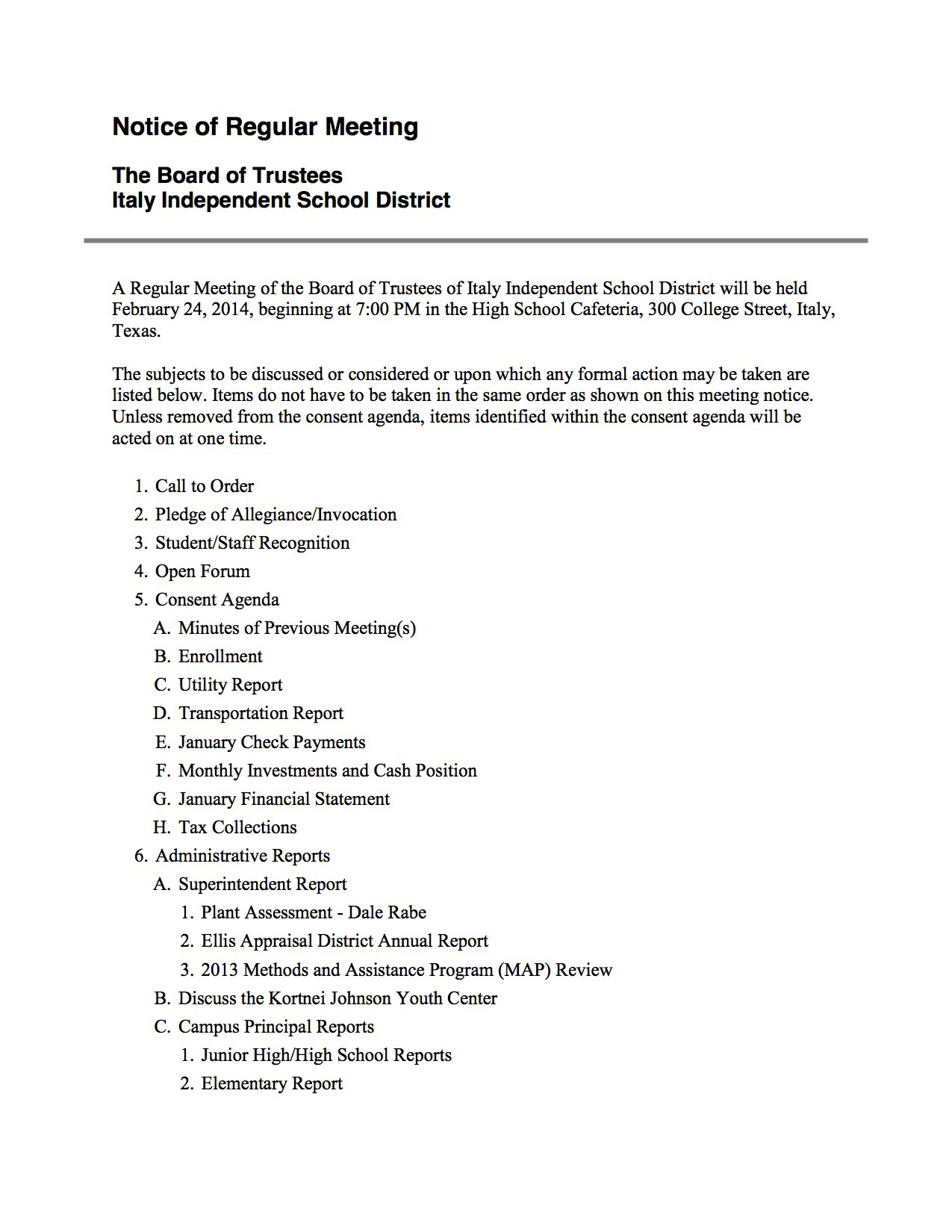 Agenda: Italy ISD School Board Meeting—Monday, February 24, 2014 « previous story album next » Agenda – page 1 Download original photo