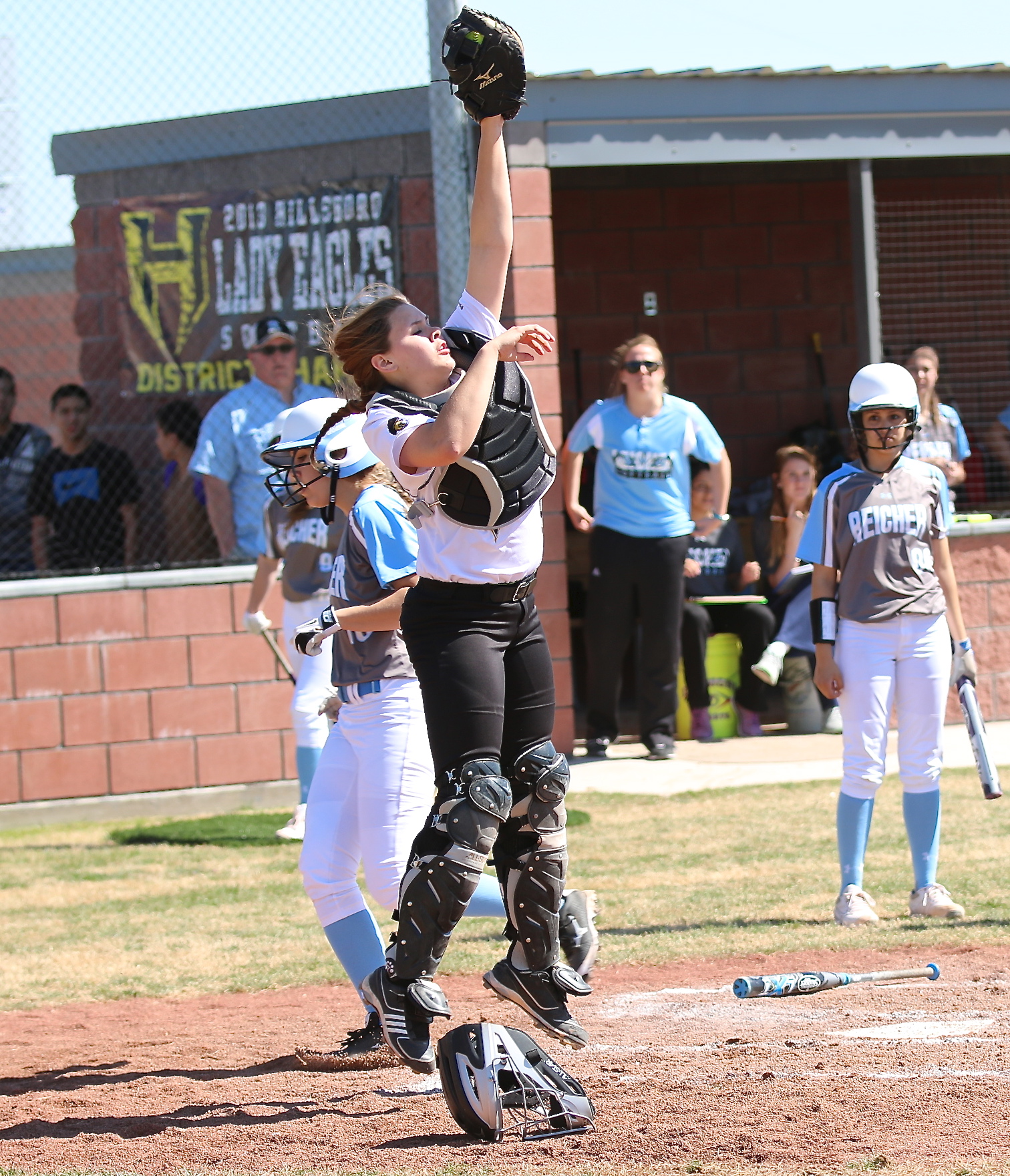 Lady Gladiators go 4-and-1 in Hillsboro tourney to finish as Consolation Winner « previous story album next » Reicher scores a run but the athleticism of catcher Lillie Perry(9) keeps the situation from escalating. (Barry Byers) Download original photo