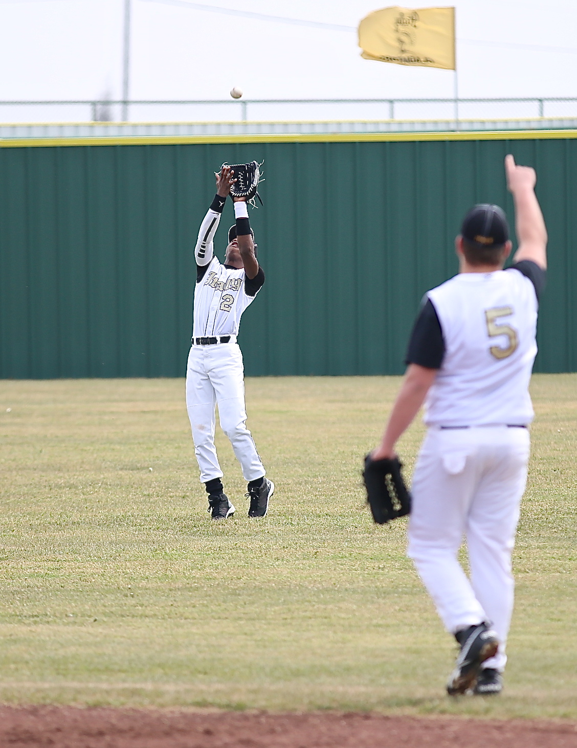 Gladiators play tournament championship game Monday, March 10, at 5:00 p.m. « previous story album next » Senior second-baseman Zain Byers(5) spots the ball for senior center fielder Eric Carson(2) who makes the catch. (Barry Byers) Download original photo