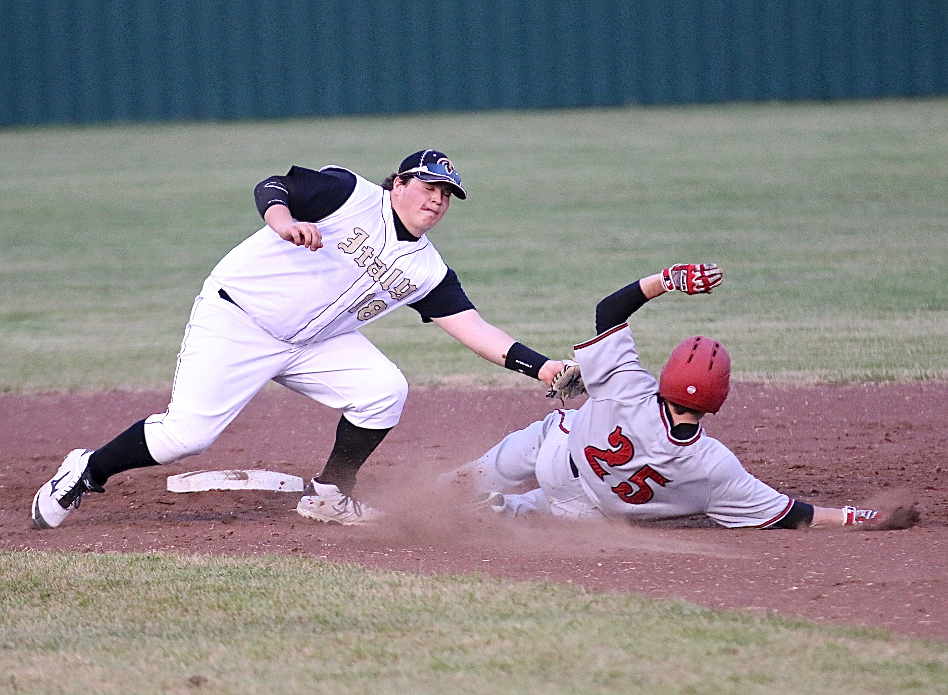 The Gladiators’ JV and varsity boys on short end of bat against Maypearl « previous story album next » Shortstop John Byers(18) tags out a Panther runner trying to steal. (Barry Byers) Download original photo