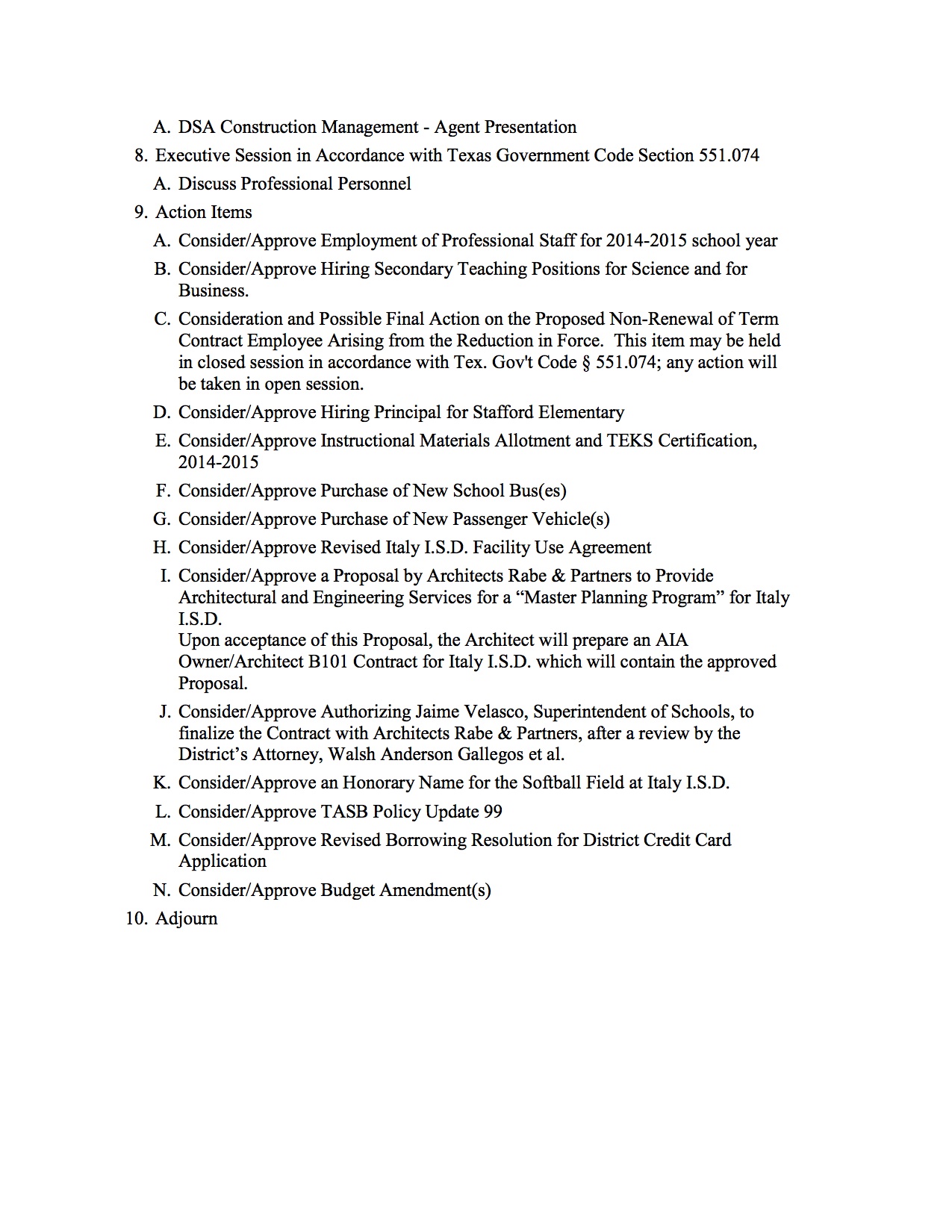 Agenda: Italy ISD School Board Meeting—Monday, March 24, 2014 « previous story album next » March 24, 2014 Agenda – page 2 Download original photo