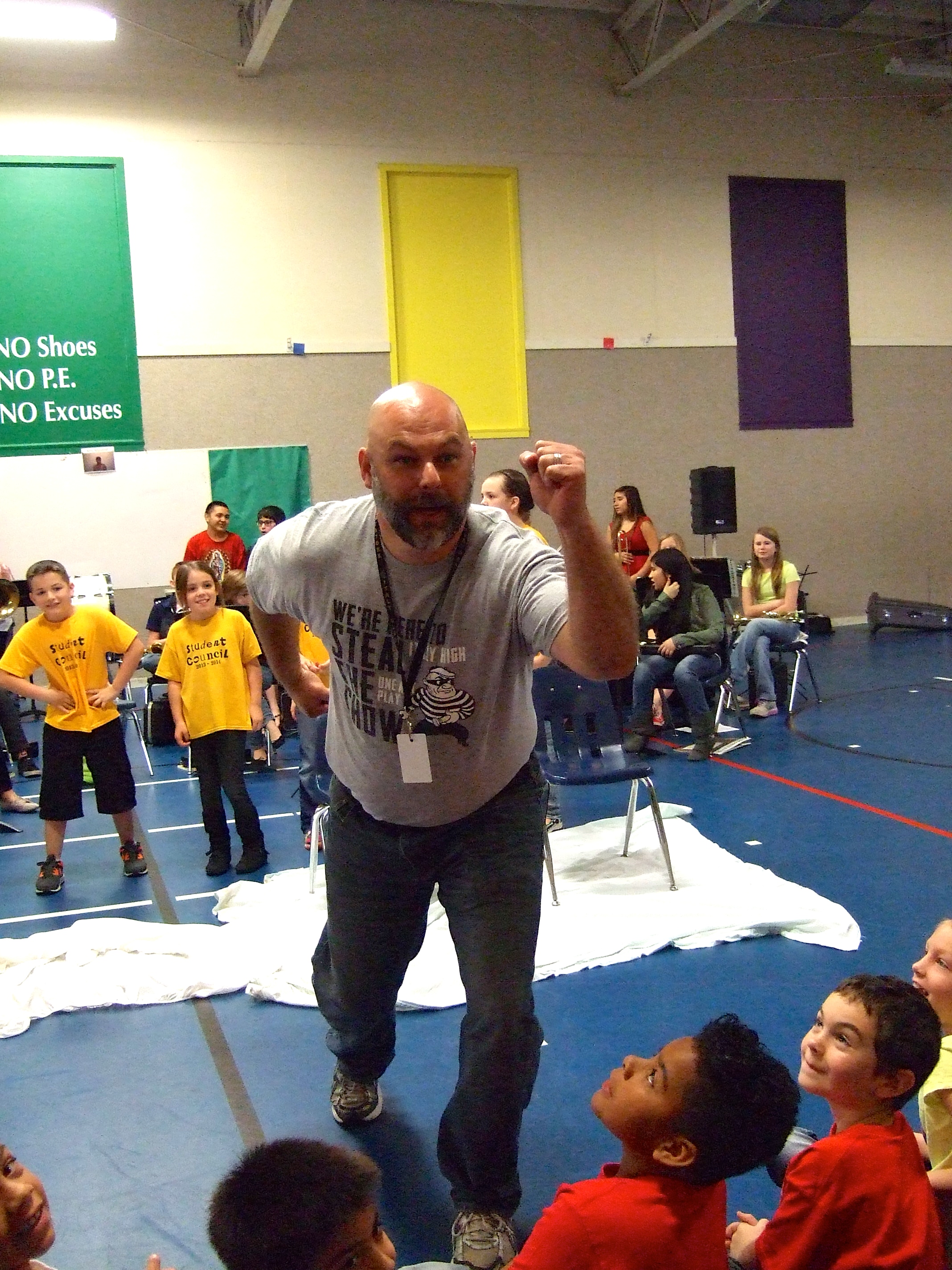 Ray Schufford and the STAAR Pep Rally at Stafford Elementary « previous story album next » Mr. Joffre daring the students to throw a pie in his face! (Cindy Sutherland) Download original photo