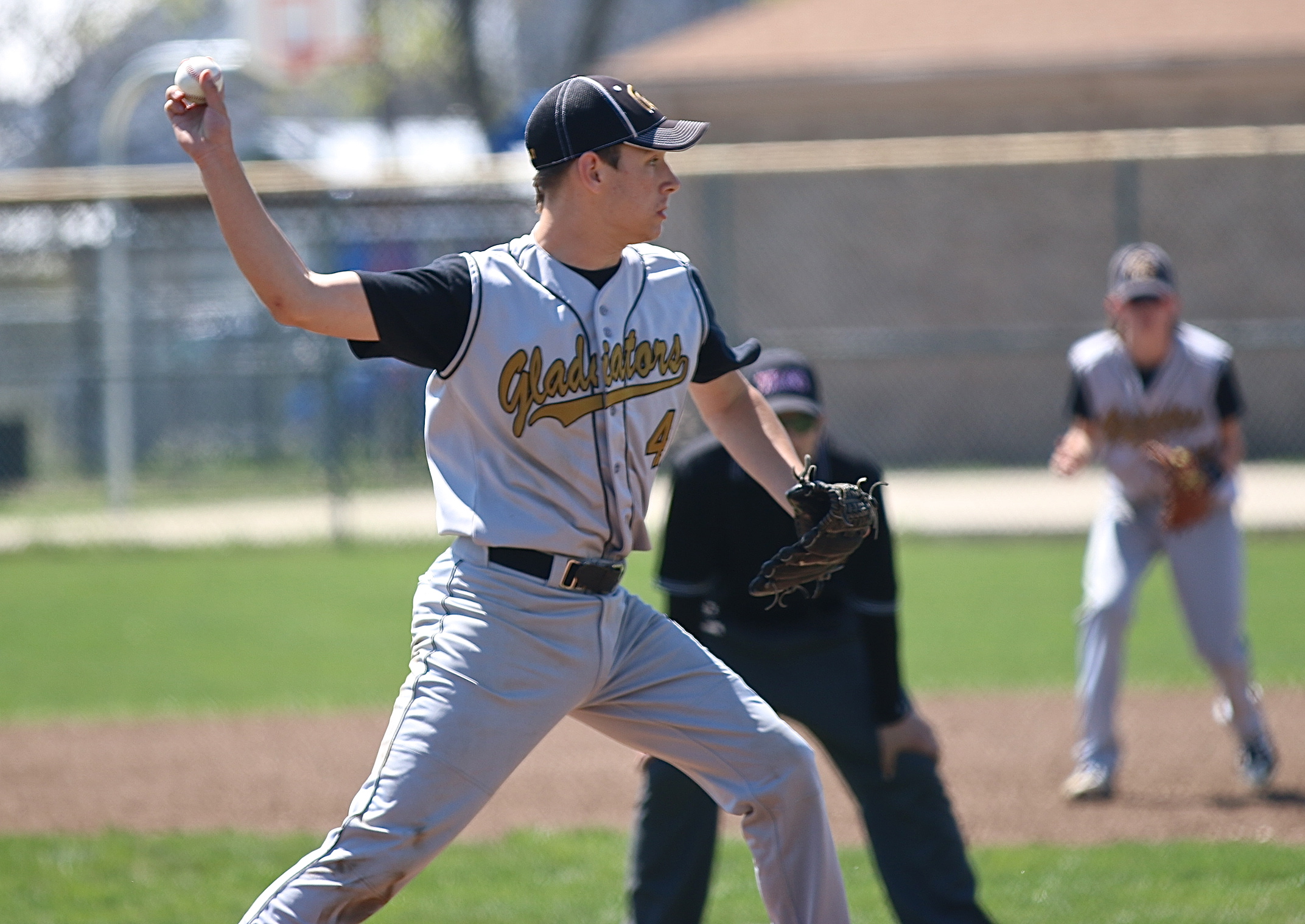 The Gladiators shutout Avalon 14-0 and improve to 2-0 in district play « previous story album next » Ryan Connor(4) tries to catch an Eagle runner nesting to far off the first-base bag. (Barry Byers) Download original photo