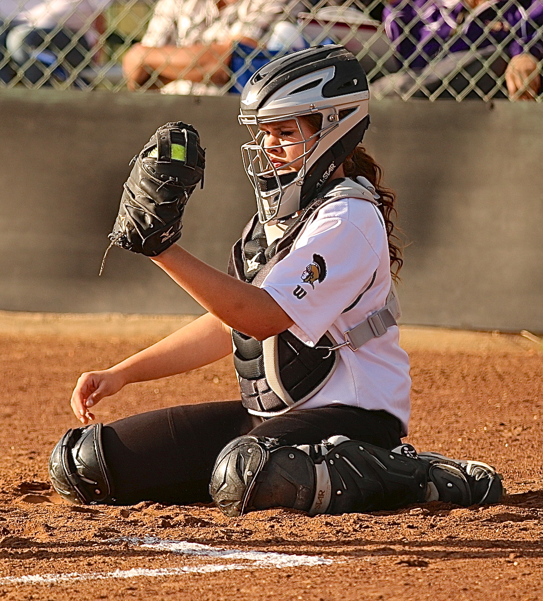 Lady Gladiators reclaim their mojo, win district rematch over Itasca 5-2 « previous story album next » Catcher Lillie Perry(9) has her own unique style when hauling a strike. (Barry Byers) Download original photo