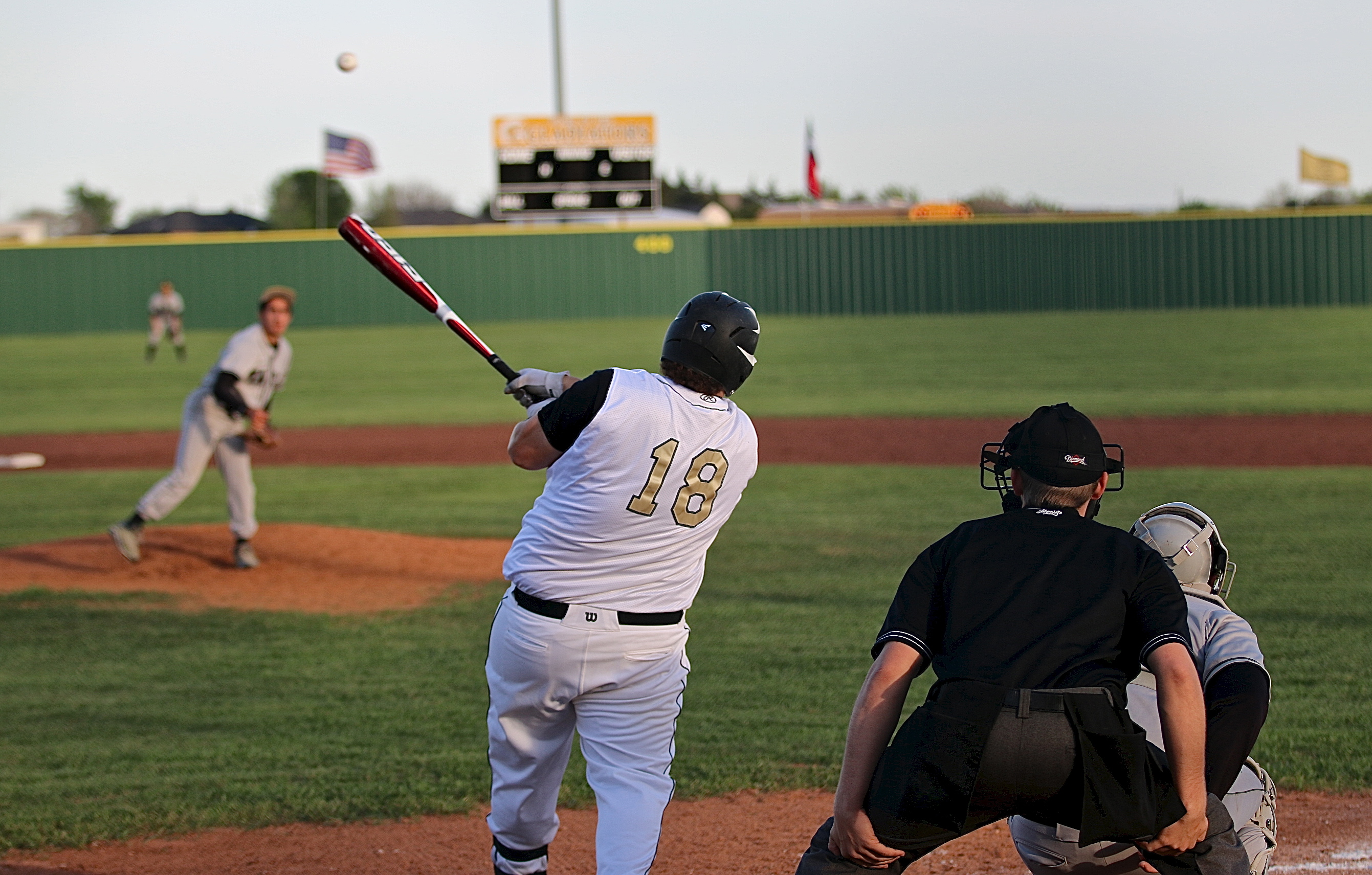 Gladiator junior John Byers(18) makes history in the first-inning with a 3 run inside the park homerun shot to center, putting the first runs up on Loyd Davidson Field’s new scoreboard. (Barry Byers)
