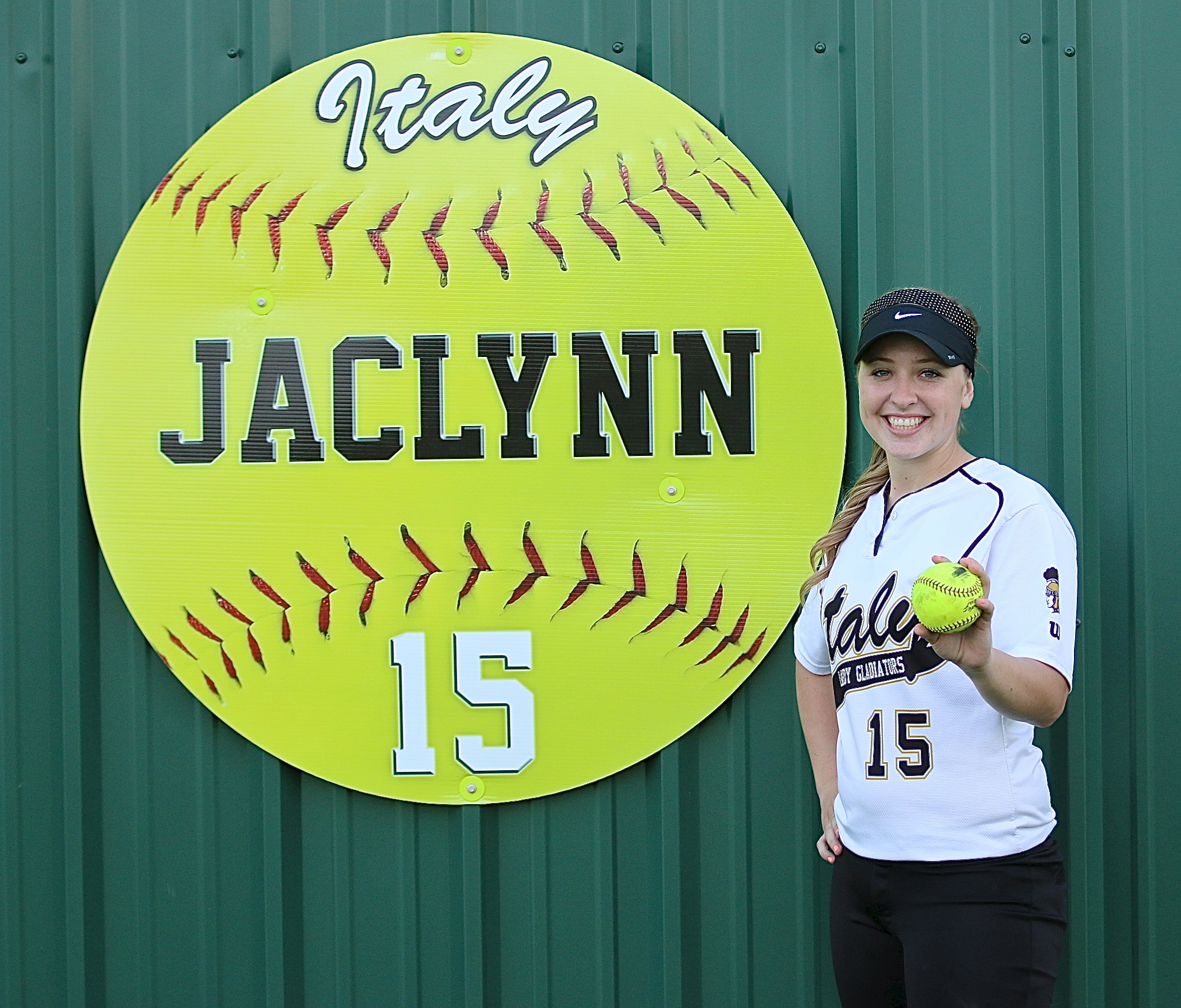 Italy’s Lewis goes yard in 10-0 win over Grand Prairie; Italy wins game two 16-0 « previous story album next » Jaclynn Lewis(15) displays her home run ball that sailed over the green wall, just above her personalized softball sign. (Barry Byers) Download original photo
