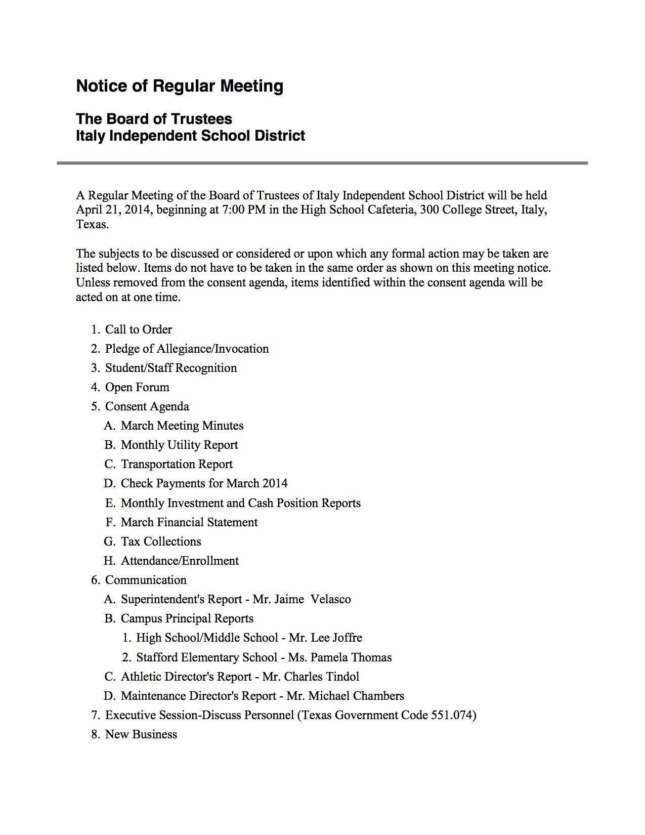 Agenda: Italy ISD School Board Meeting—Monday, April 21, 2014 « previous story album next » Agenda – page 1 Download original photo