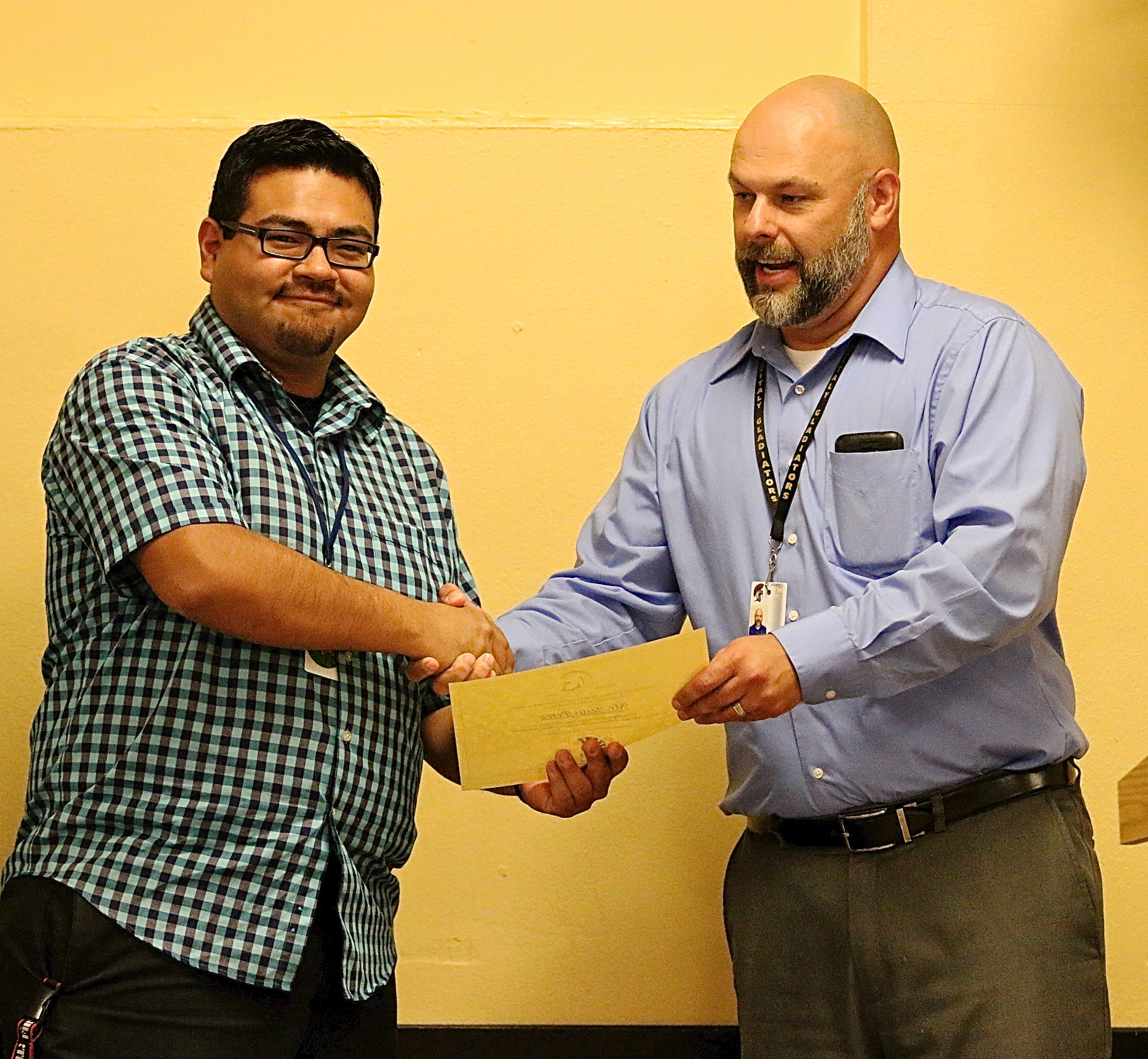 Jesus Perez is also presented a certificate from Principal Lee Joffre recognizing he and the Gladiator Regiments Band’s accomplishments for the school year. (Barry Byers)