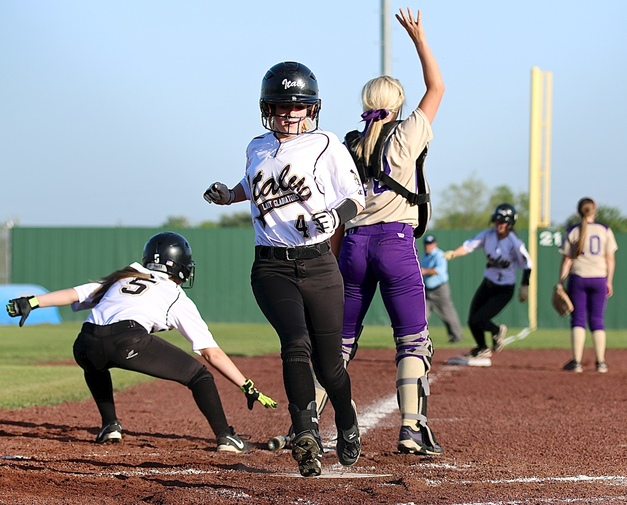 Lady Gladiators drop a heartbreaker to Mart in 9-8 bi-district loss « previous story album next » Tara Wallis(5) gets the bat out of the way as fellow base runners Britney Chambers(4) and Bailey Eubank(1) hurry into score. (Barry Byers) Download original photo