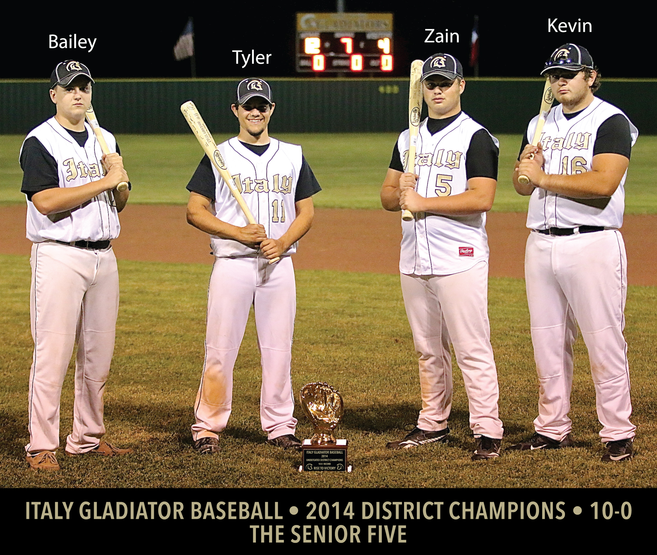 The Senior Five (minus one with teammate Eric Carson competing representing Italy Track & Field at regionals in Abilene): Pictured are Bailey Walton, Tyler Anderson, Zain Byers and Kevin Roldan. The Gladiators posted a perfect district record of 10-0 to go with their 2014 District Championship after defeating the Frost Polar Bears 12-4 in Italy at Davidson Field. (Barry Byers)
