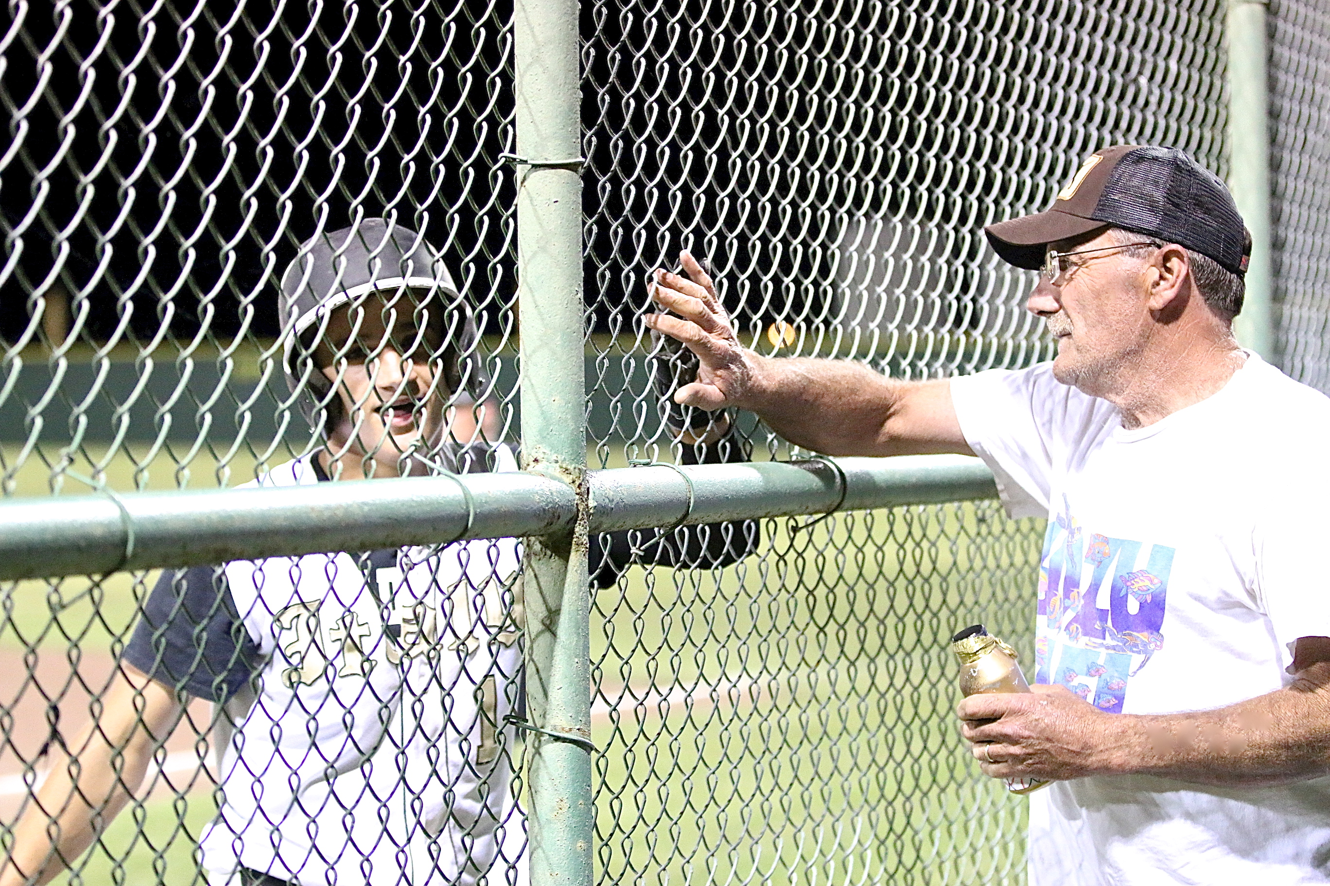 Levi McBride(7) receives a love tap from his father Darrell McBride after Levi completes his second home run lap of the season during a 12-4 win over Frost. No fences here. (Barry Byers)