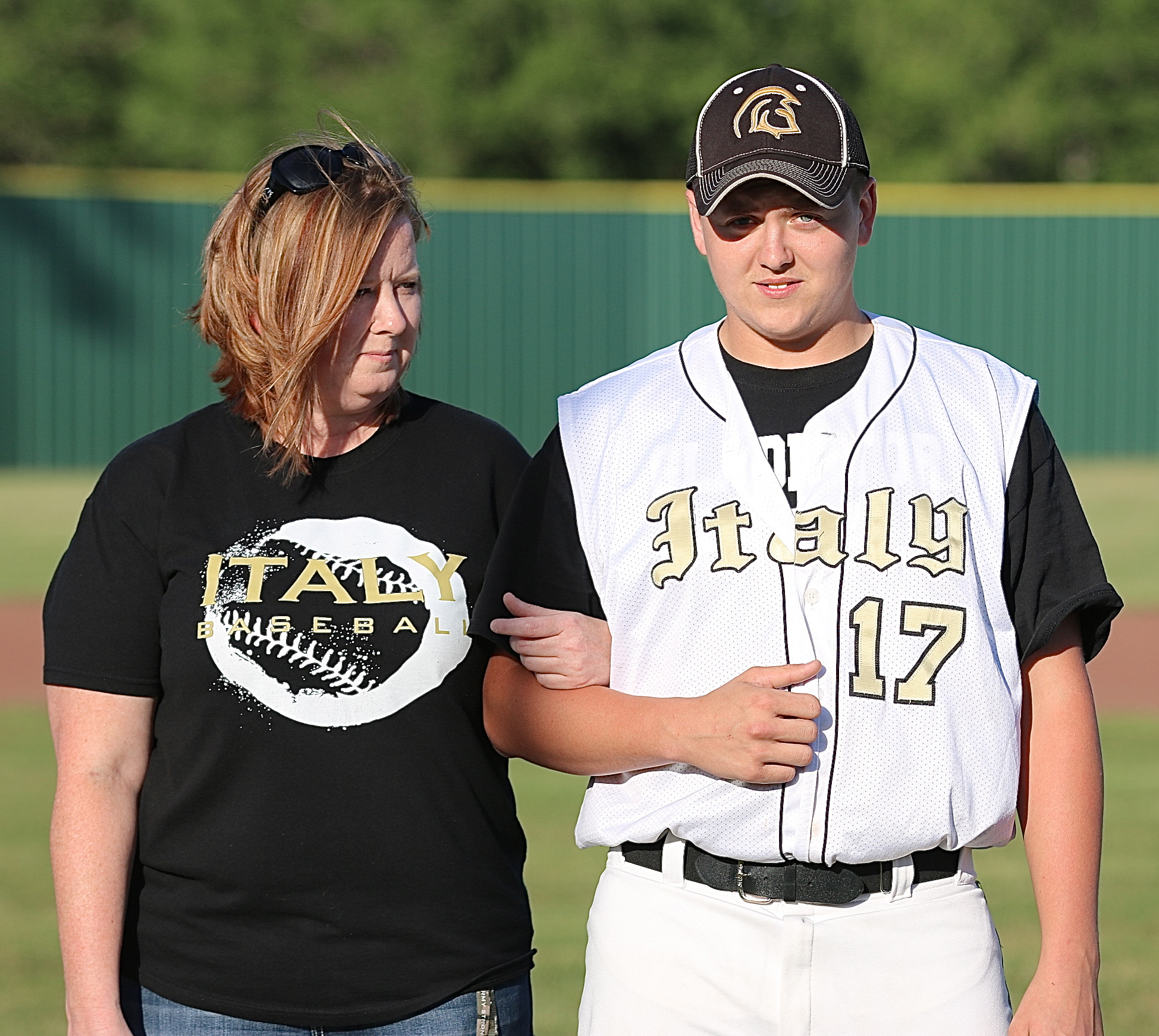 Gladiator Baseball senior Bailey “Biscuit” Walton(17) is proudly escorted out by his mother, Michele Richards Walton, for Bailey’s final home game at Davidson Field in Italy. (Barry Byers)