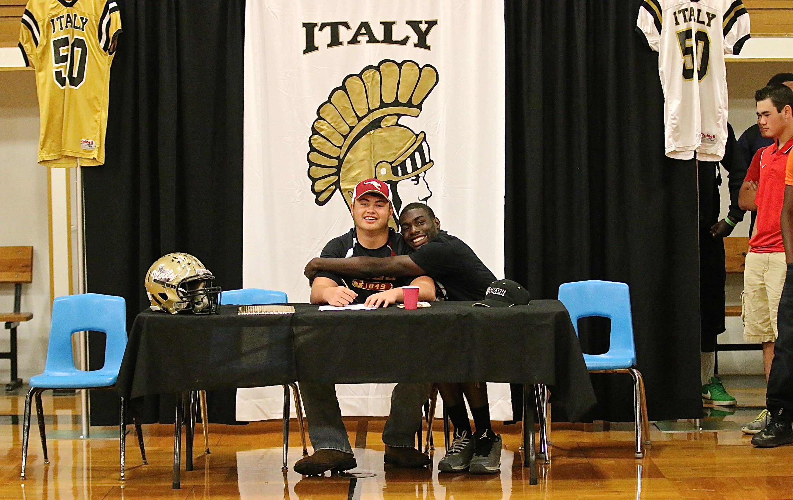 Zain Byers is feeling the love after signing his letter of commitment inside George E. Scott Coliseum on the Italy High School campus. Providing the hug is senior teammate TaMarcus Sheppard. (Barry Byers)