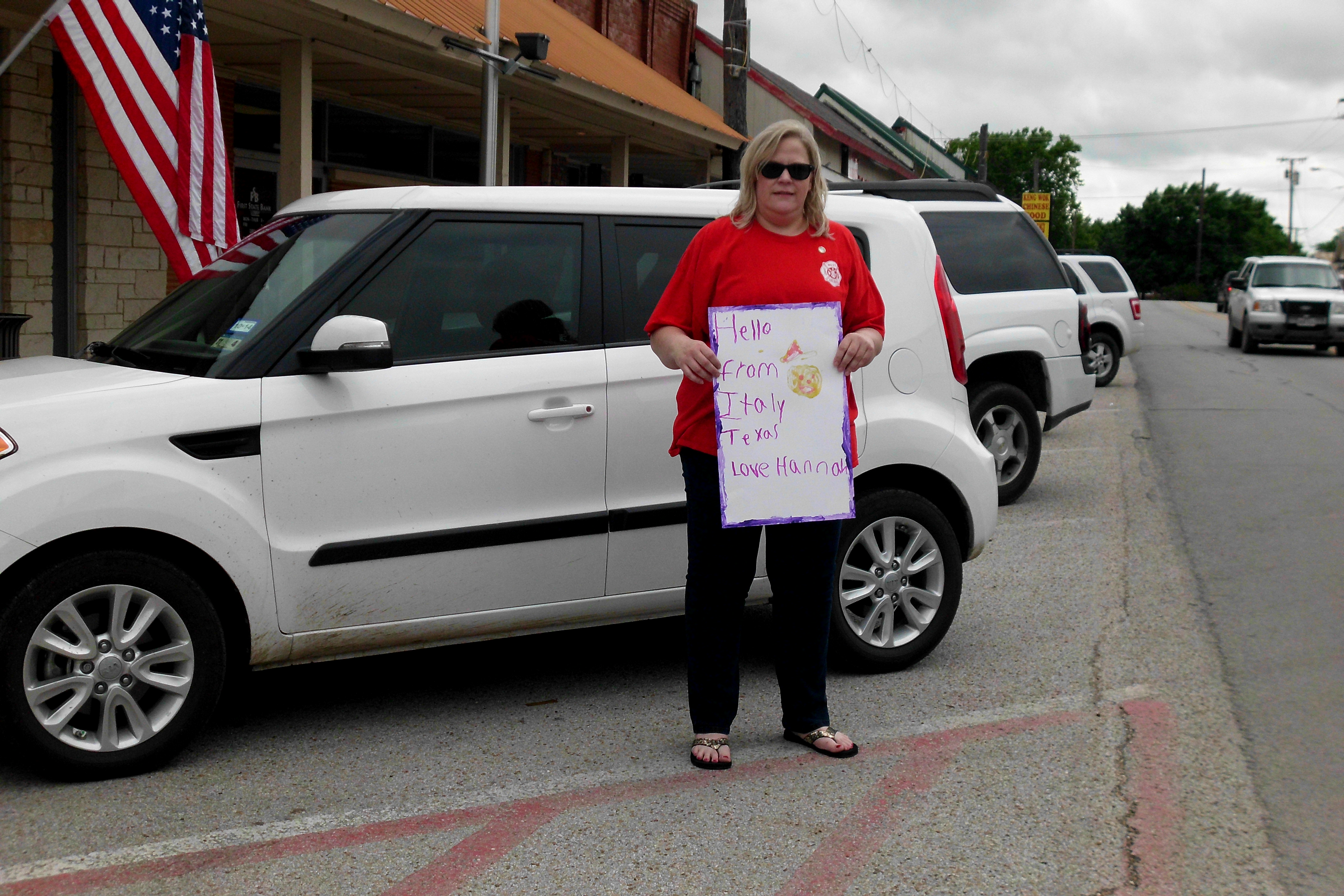Brotherhood Ride « previous story album next » Susan Harris holds a sign her daughter, Hannah, made to welcome the riders to Italy. (Karen Mathiowetz) Download original photo