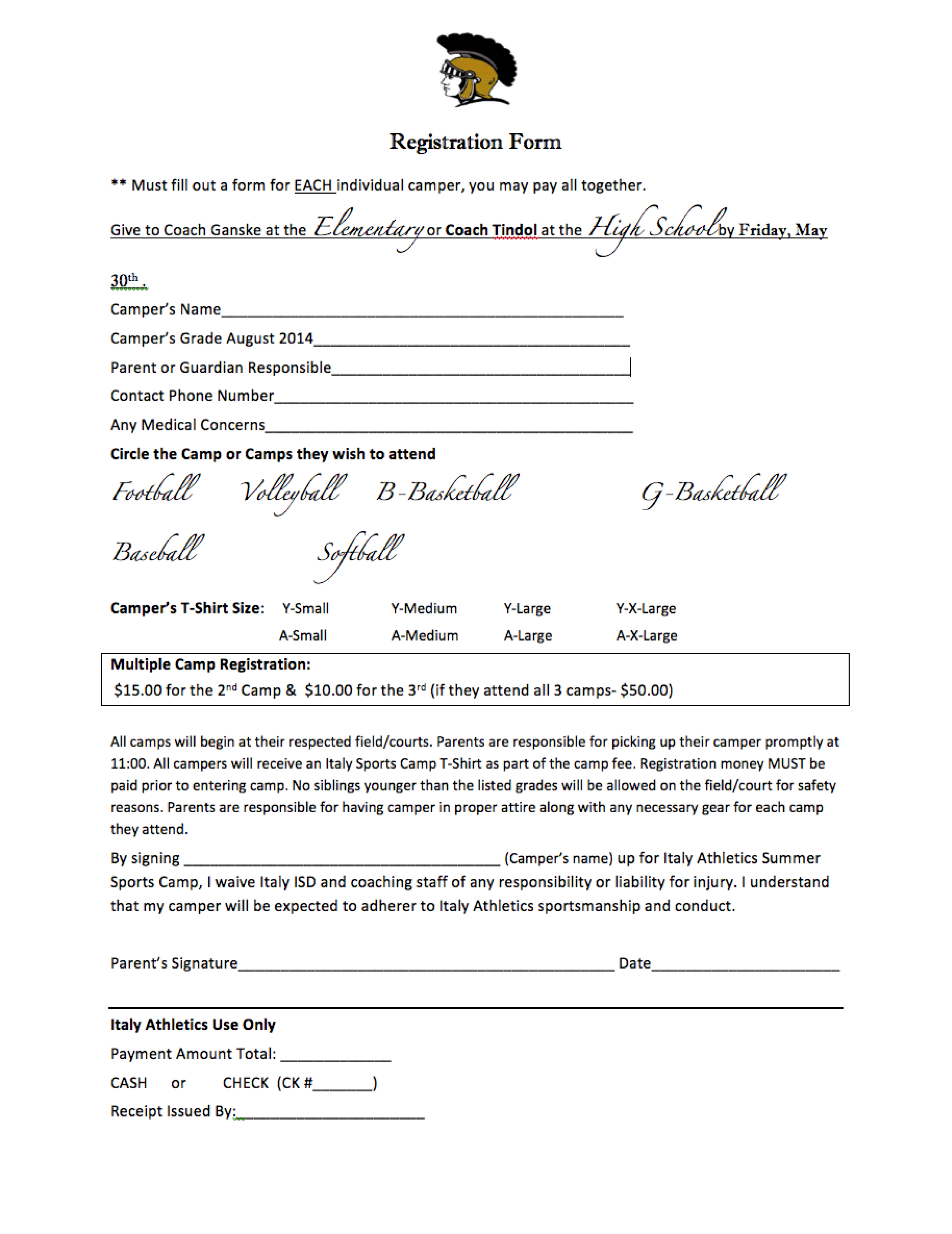 Registration for Italy High School Athletics Summer Sport Camps are underway « previous story album next » Registration Form for Summer Camps. Double-click to enlarge image. Set Print Dialogue box to Fit-to-page before printing. Download original photo