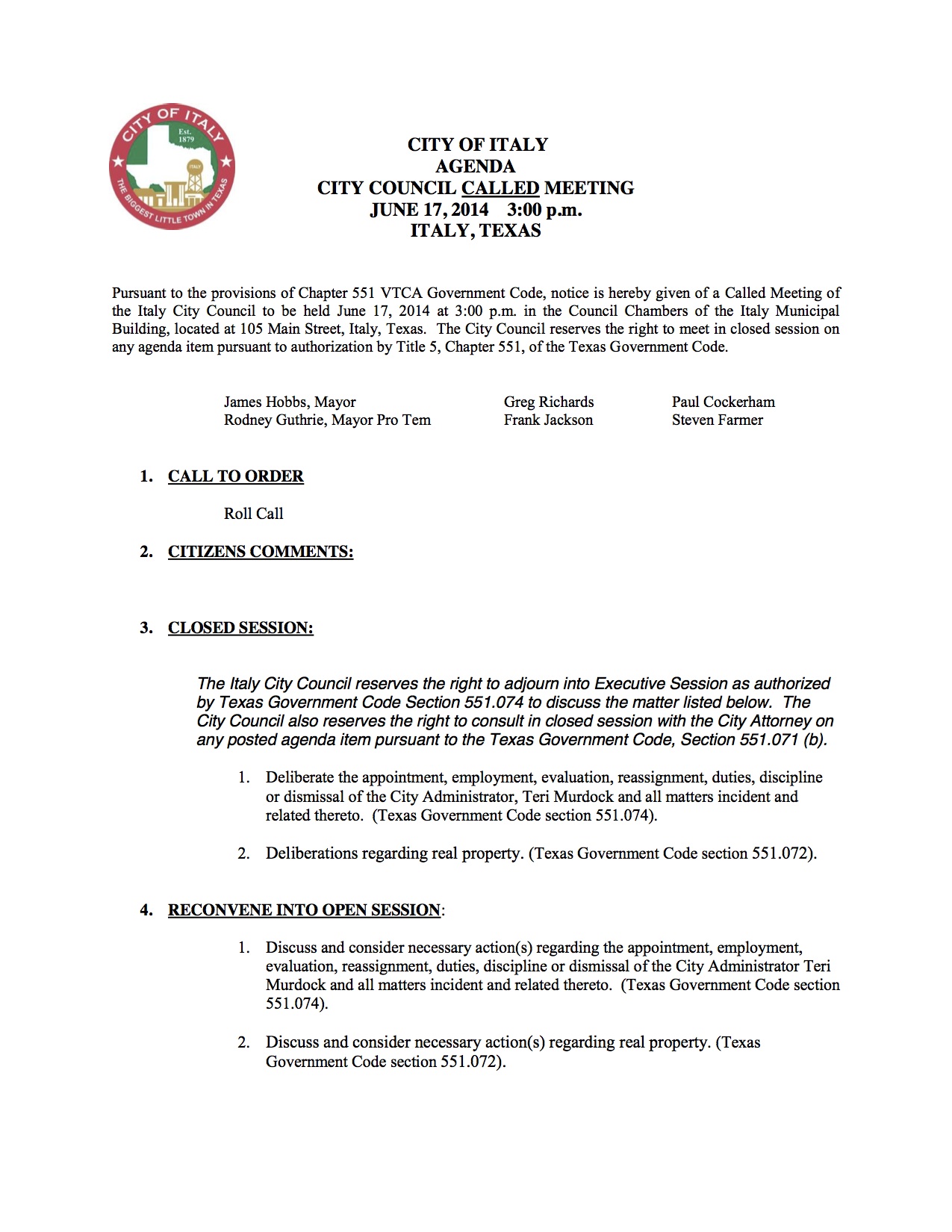 Agenda: Italy City Council Called Meeting—Tuesday, June 17, 2014 « previous story album next » Agenda – page 1 Download original photo