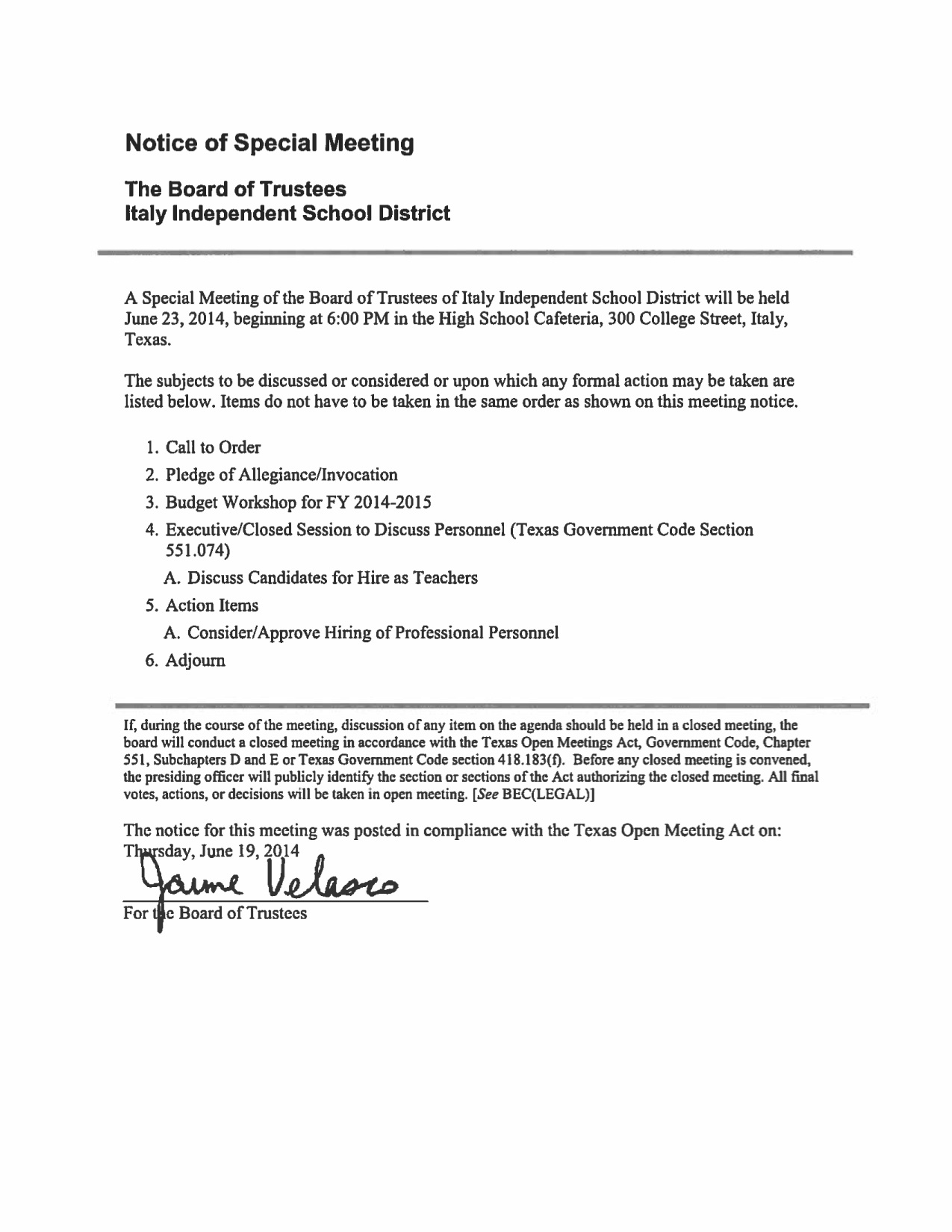 Agenda: Italy ISD School Board Special Meeting — Monday, June 23, 2014 « previous story album next » Download original photo