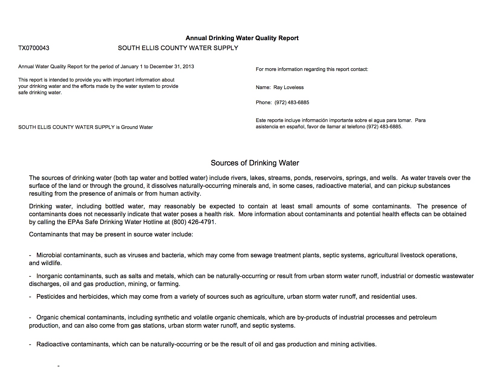 South Ellis County Water Supply Corp. releases annual drinking water report « previous story album next » Annual Drinking Water Quality Report – page 1 Download original photo
