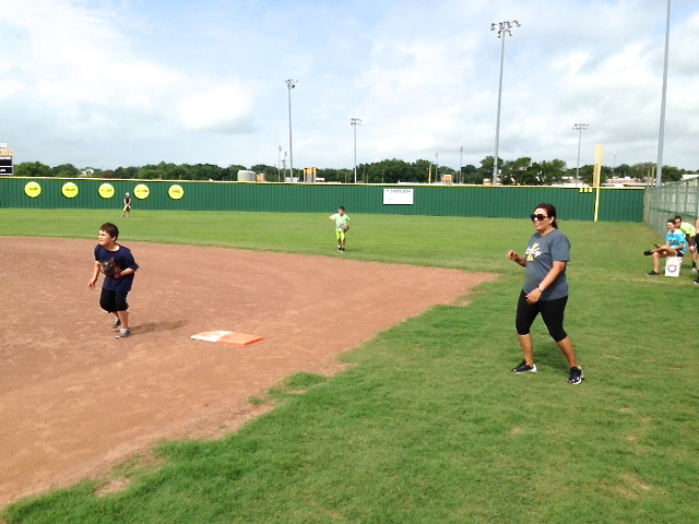 Baseball and Softball Gladiators learn at camps and then challenge each other « previous story album next » Softball Coach Tina Richards encourages her hitters as they make their way down the first base line. (Submitted photo) Download original photo