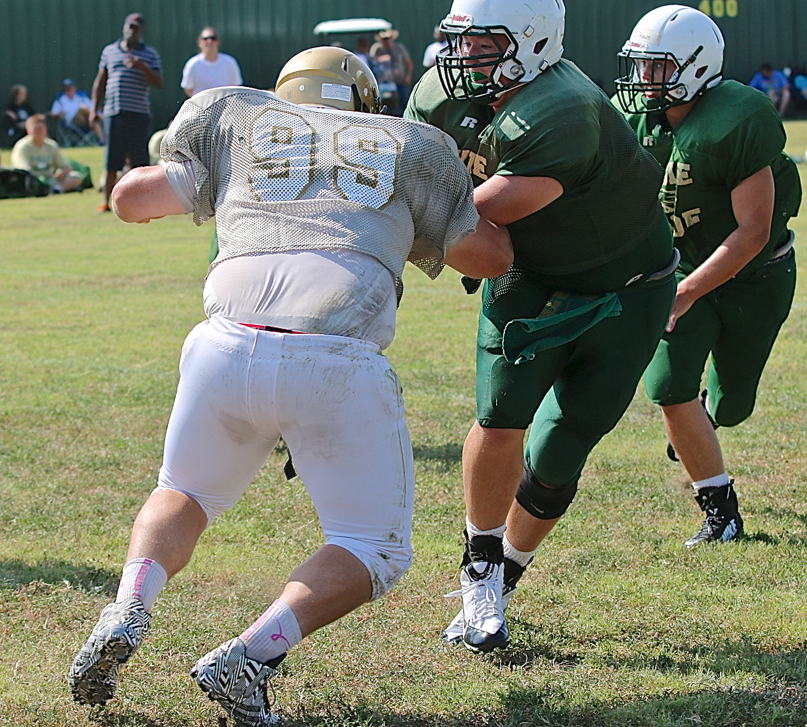 Italy clashes with Valley Mills in a physical grid-iron scrimmage « previous story album next » Gladiator right offensive tackle John Byers(99) slows down the pursuit of a pair of Eagles. (Barry Byers) Download original photo