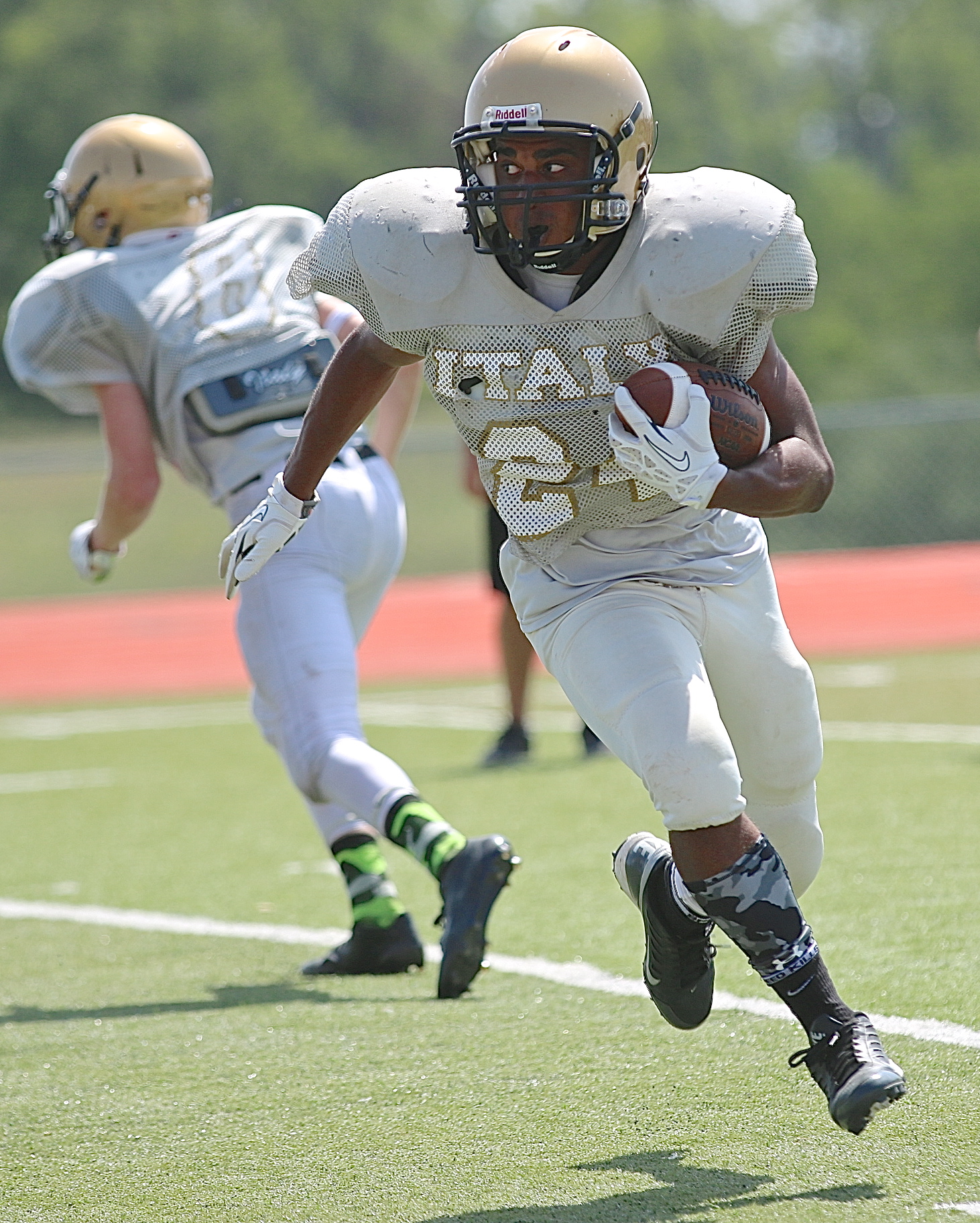 The Gladiators give newcomers and JV players plenty of reps in Palmer scrimmage « previous story album next » Gladiator Clayton Miller(6) hands off to Jaray Anderson(24) who looks to gain some yards for Italy. (Barry Byers) Download original photo