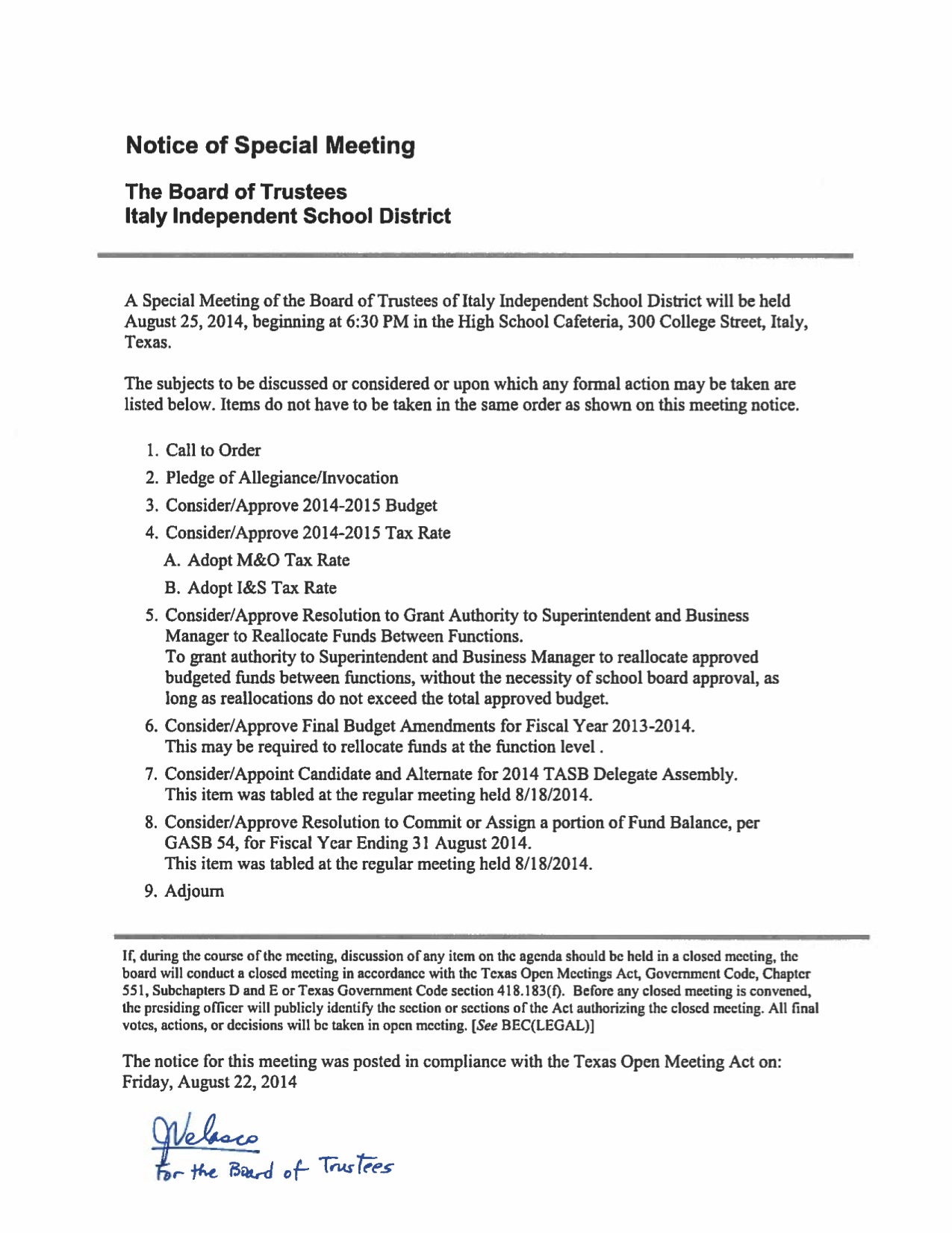 Agendas: Italy ISD School Board Hearing and Meeting — Monday, August 25, 2014 « previous story album next » Agenda – IISD School Board Called Meeting Download original photo
