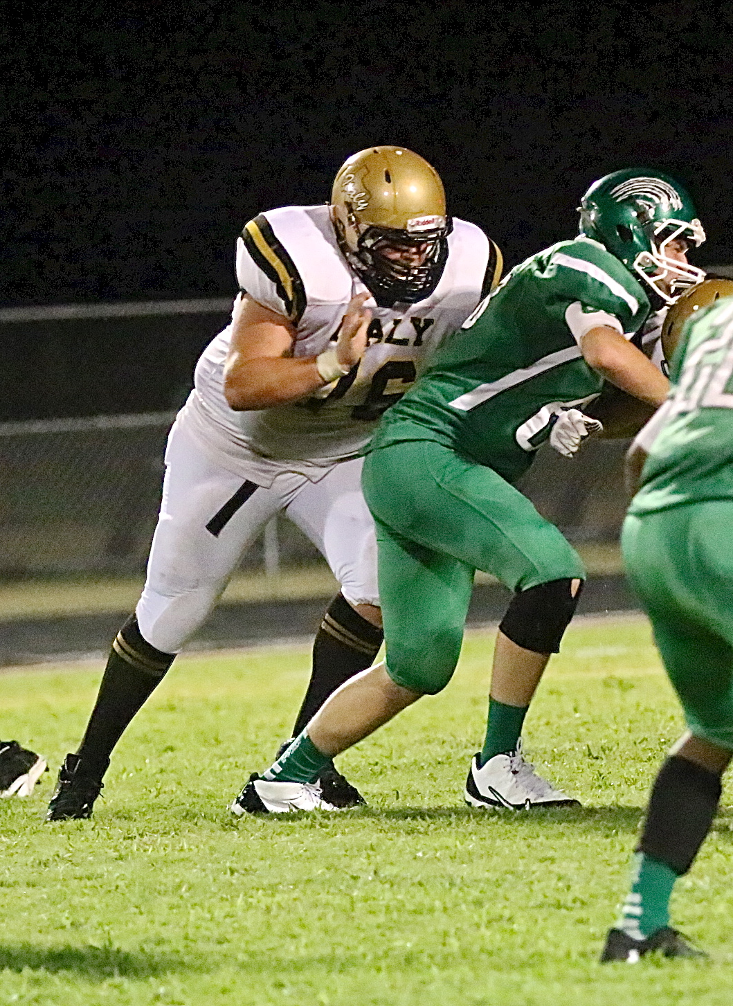 Gladiators drop season opener to Kerens « previous story album next » Senior right offensive guard Colin Newman(76) zeroes in on a Bobcat defenseman. (Barry Byers) Download original photo