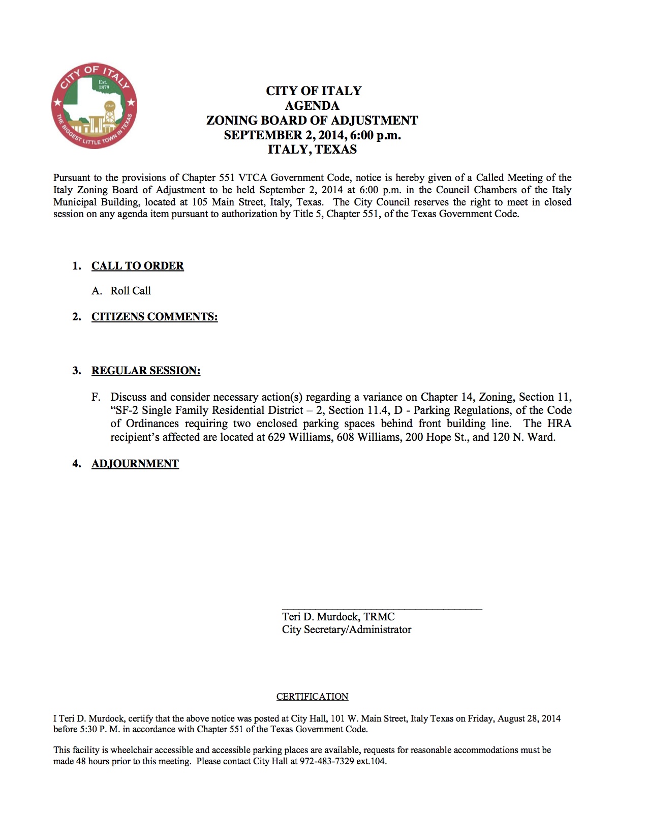 Agenda: Italy Zoning Board of Adjustment—Tuesday, September 2, 2014 « previous story album next » Download original photo