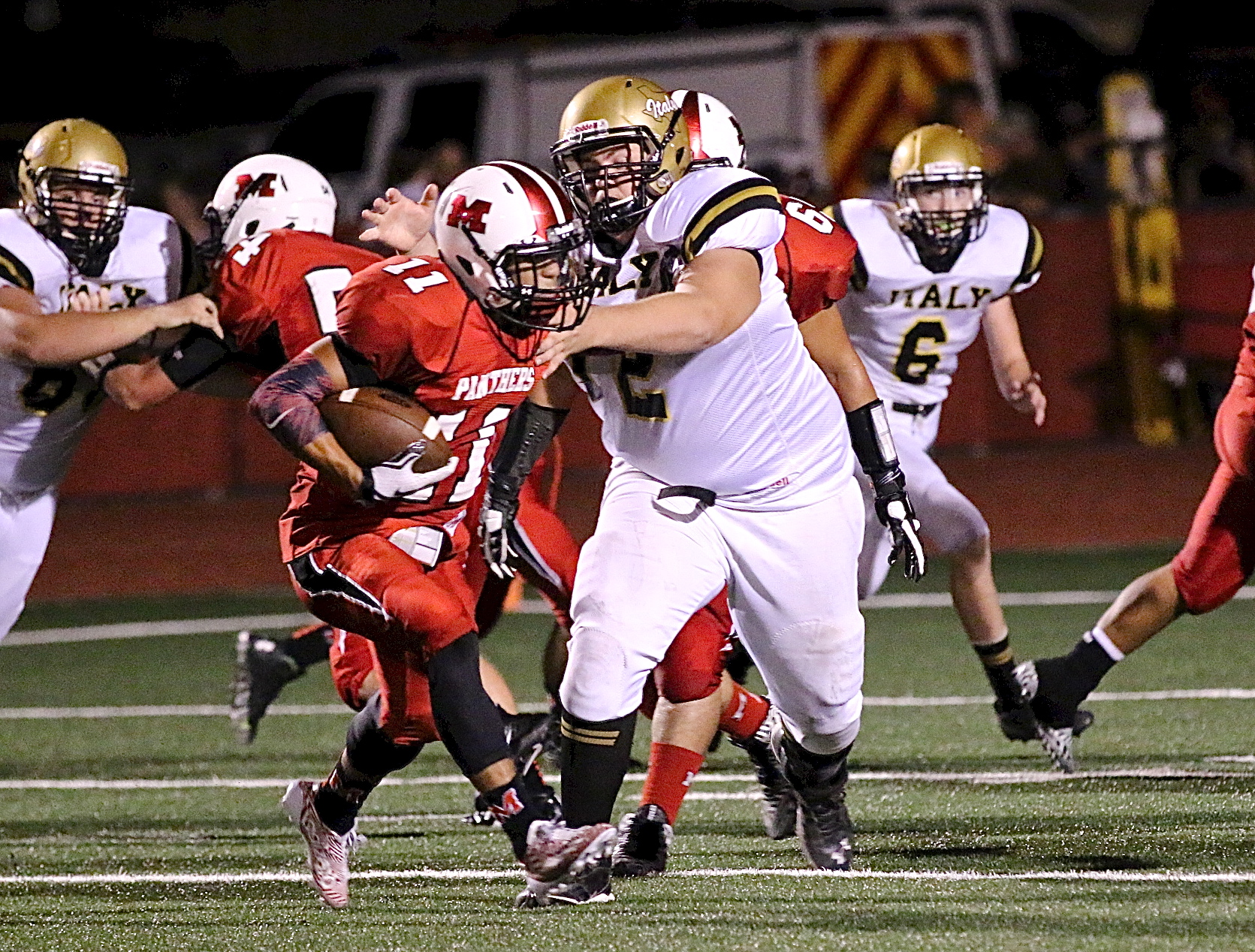 Gladiators struggle against Maypearl in week 2 « previous story album next » Aaron Pittmon(72) bullies his way into the Maypearl backfield to tackle a Panther for a loss. (Barry Byers) Download original photo
